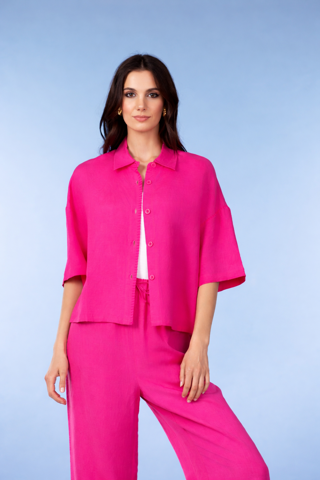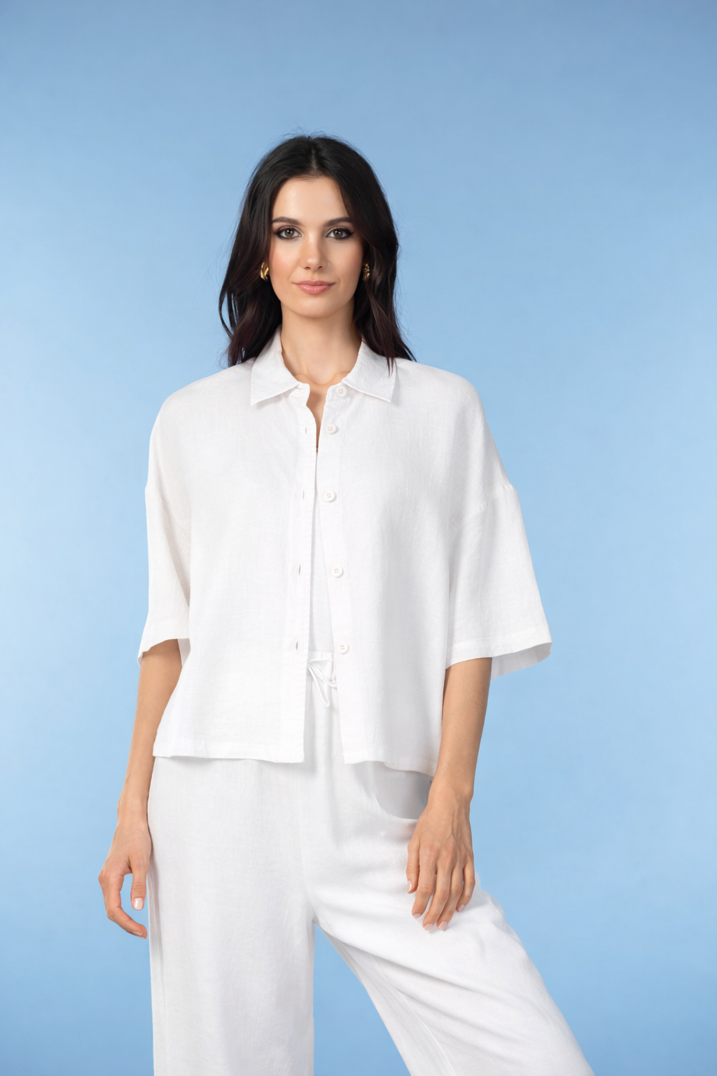 A relaxed button-front blouse perfect for warm weather. The lightweight fabric and breezy cut create an effortlessly polished look that works layered or buttoned up. Short sleeves and a classic collar add timeless style to this versatile wardrobe essential.