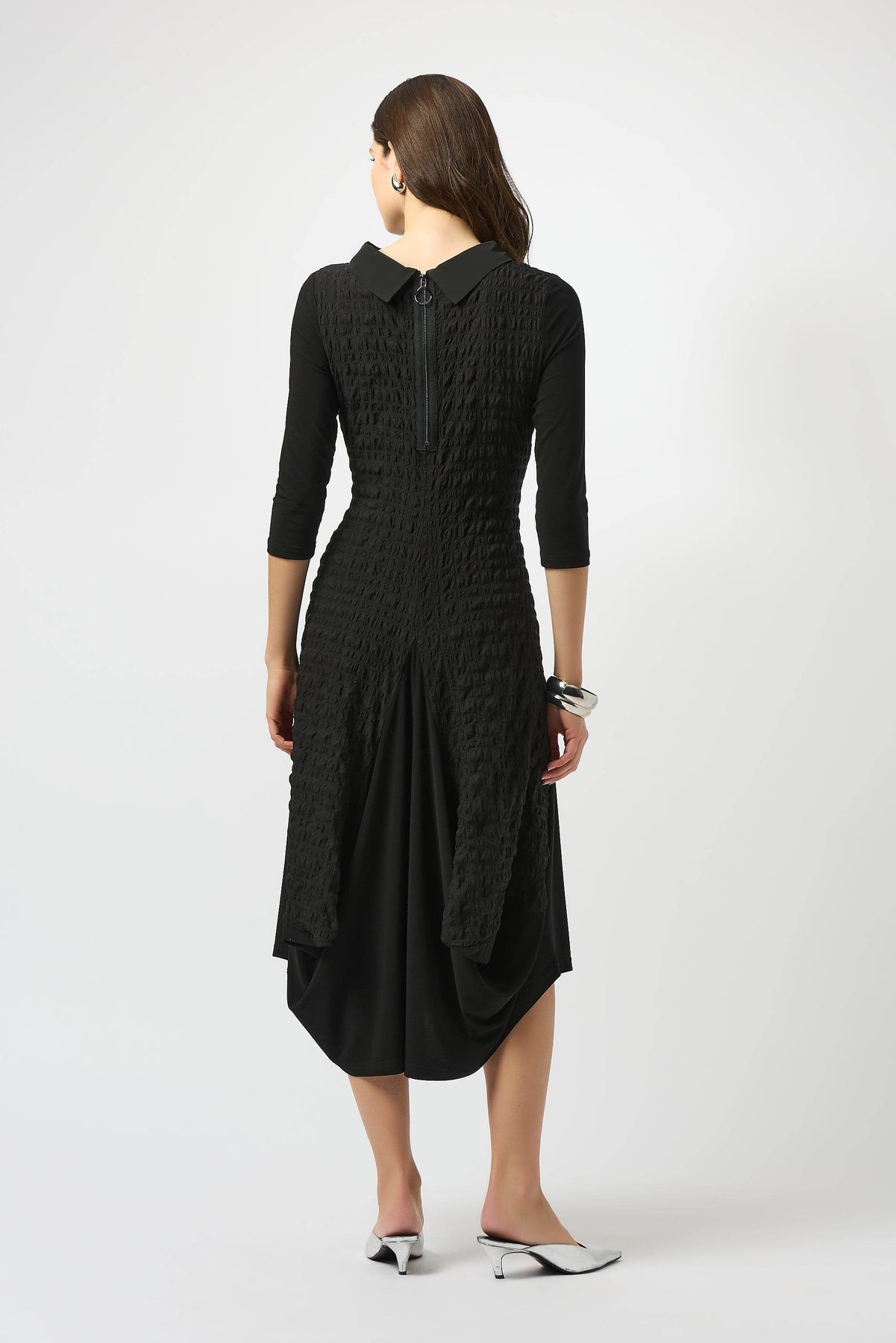 Experience elegance in this silky knit dress, beautifully detailed with bubble jacquard and memory fabric accents. Its flattering cocoon shape is complemented by a cowl neckline and three-quarter sleeves, while convenient front pockets add functionality. The discreet back zipper and refined below-the-knee length complete a look that is both sophisticated and effortlessly captivating.