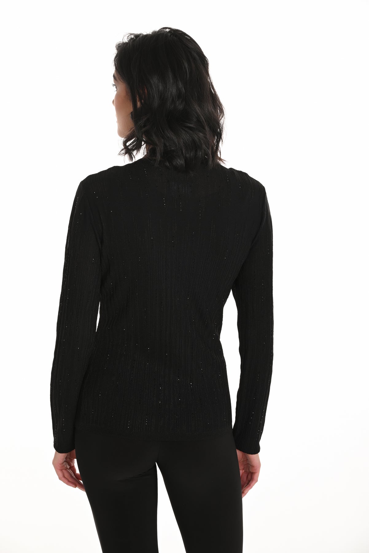 This sleek long-sleeve knit is delicately woven with subtle silver sparkle threads that catch the light in the softest, most refined way — never flashy, always elegant. The fit is smooth and flattering, offering effortless stretch and comfort while maintaining a polished silhouette. Perfect for evenings out, holiday gatherings, or simply adding a touch of luxe to your daily look. Understated glamour that goes with everything.