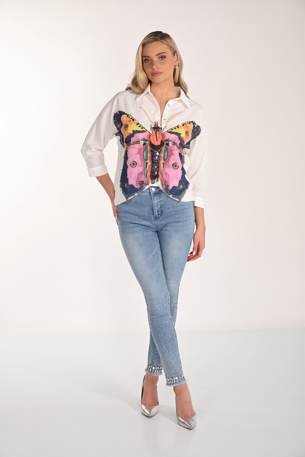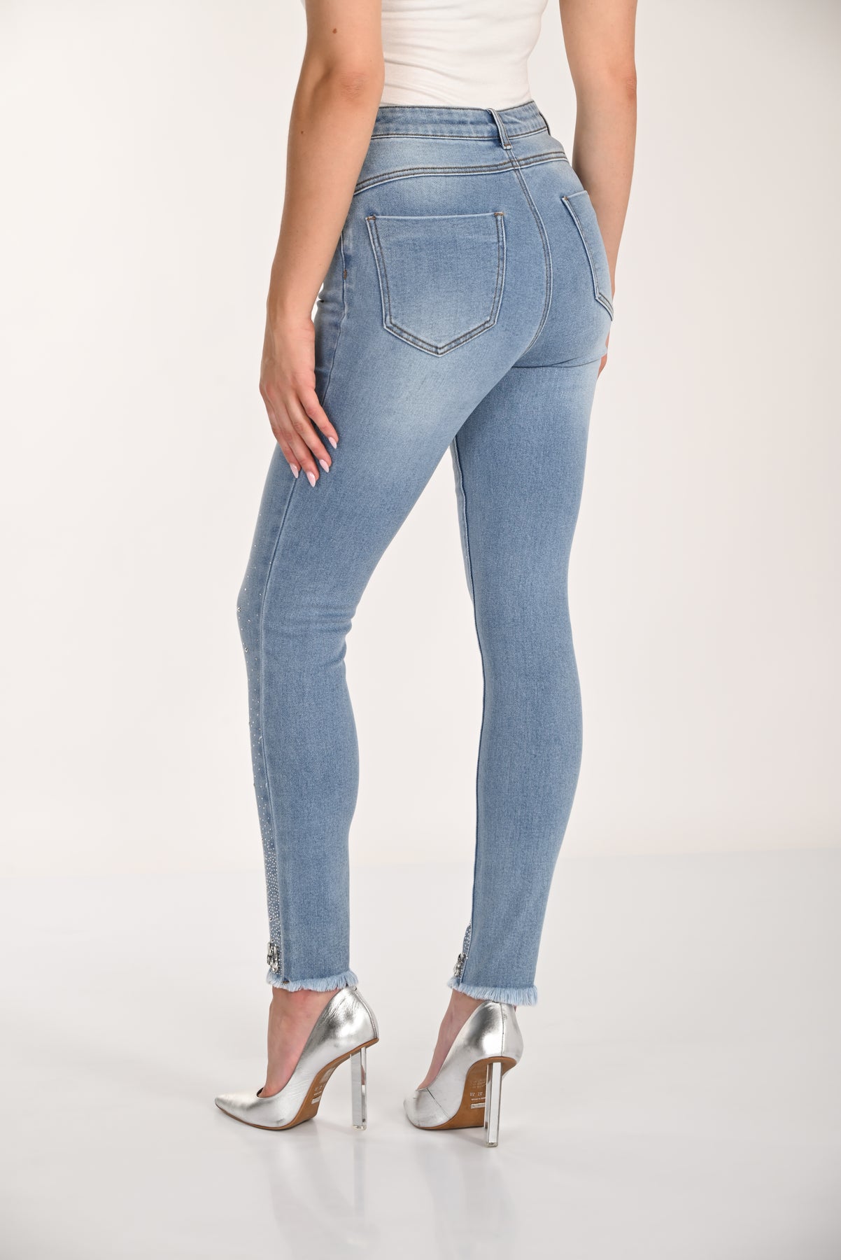 Add a touch of sparkle to your everyday denim with the Crystal Edge Skinny Jean. Designed in a flattering high-rise silhouette, this sleek slim-leg style contours beautifully while offering comfortable stretch for all-day wear. Subtle crystal embellishments cascade along the lower leg, finishing with a statement embellished hem for elevated shine. Classic five-pocket styling and a timeless light wash make this pair easy to dress up with heels or style casually with flats. Effortlessly chic, these jeans bring glamour to your everyday wardrobe.