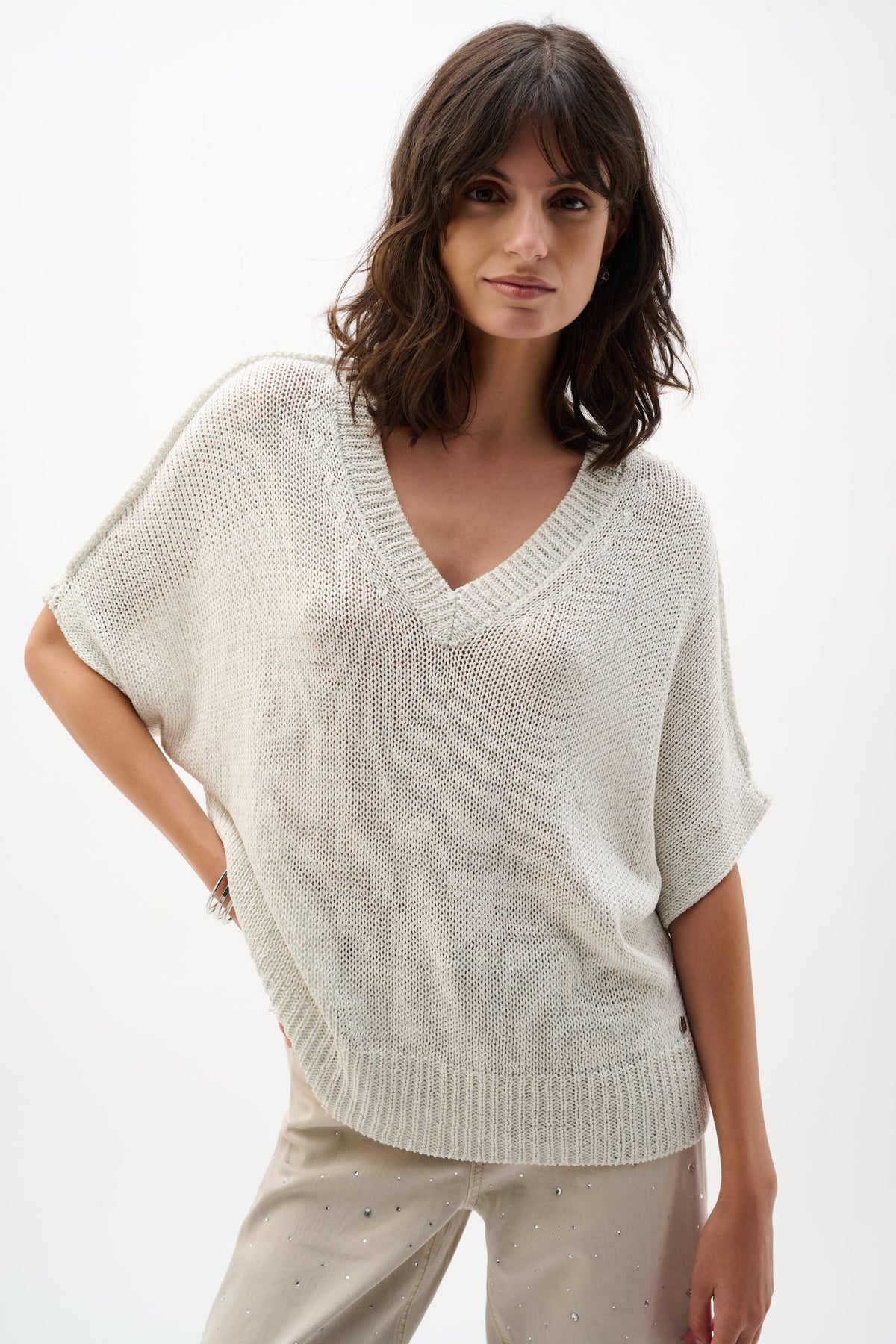 Effortless elegance meets everyday comfort in this stunning viscose and lurex blend. The relaxed straight cut flatters every figure while the sophisticated V-neckline draws the eye upward. Dolman sleeves with ribbed cuffs add a touch of refined style without sacrificing the ease you crave. Perfect for transitioning from office to evening, this top delivers that coveted balance of polished and laid-back in one versatile piece.