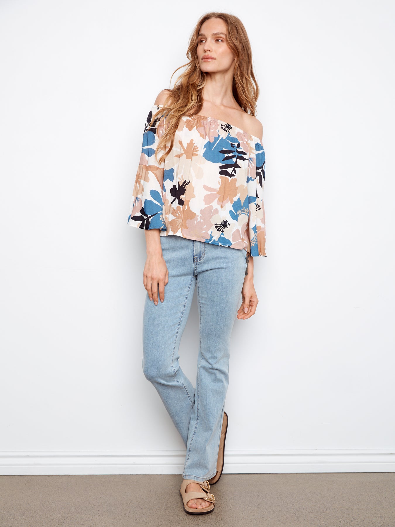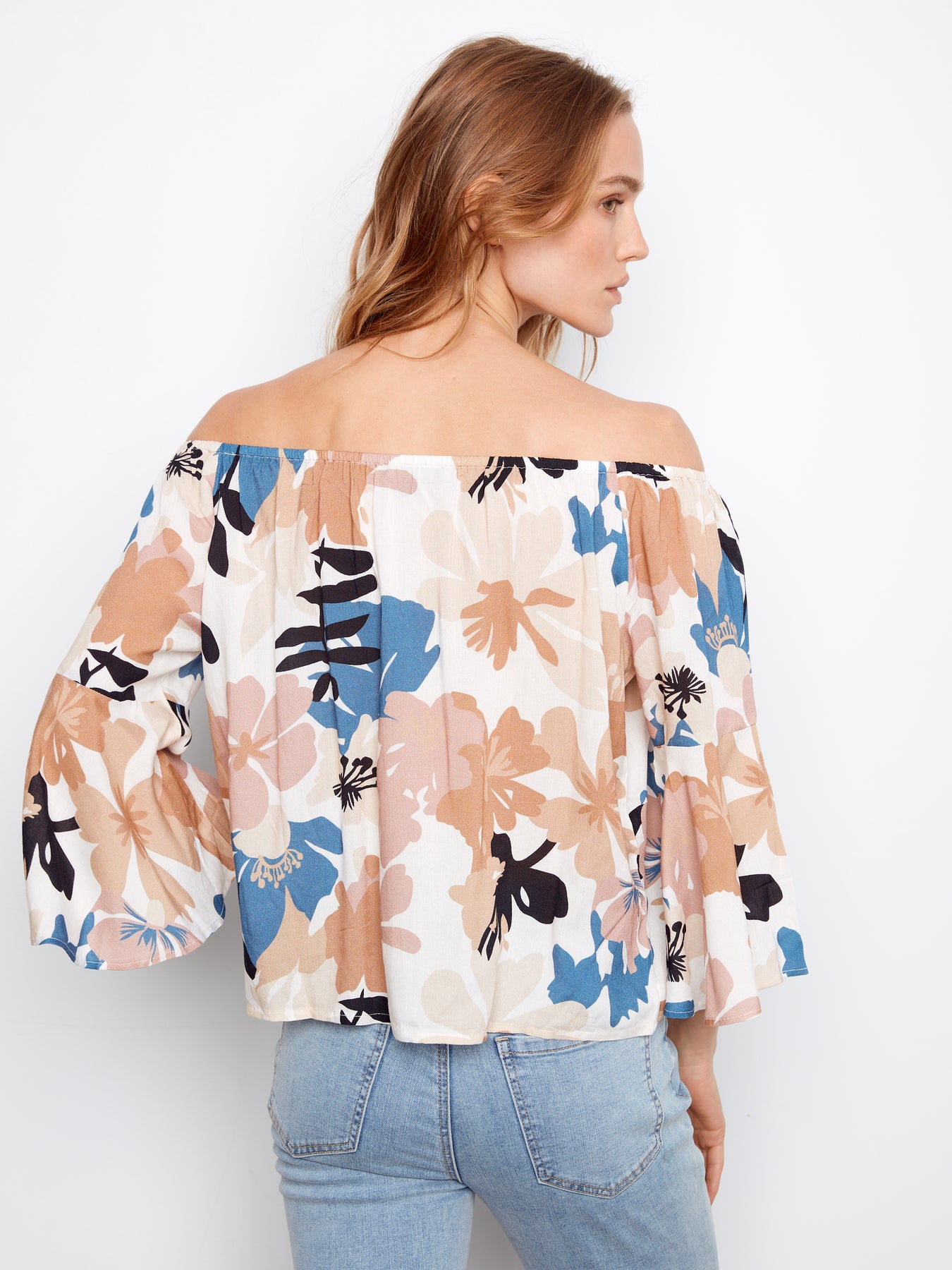 This breezy off-shoulder blouse brings effortless drama to warm-weather styling. The wide neckline sits beautifully across the shoulders, highlighting the collarbone while creating a soft, feminine silhouette. An allover floral-inspired print adds a bold yet airy feel, blending color and movement for standout appeal.