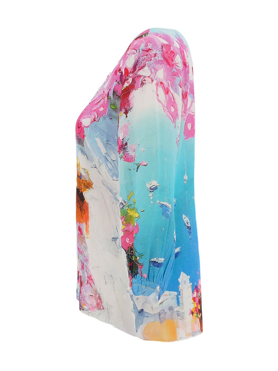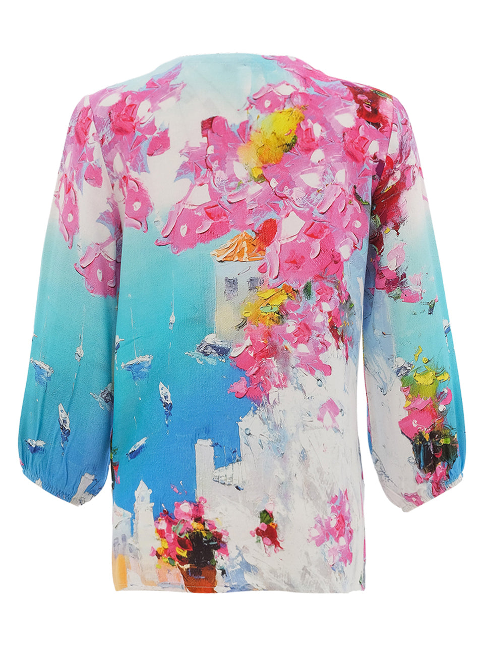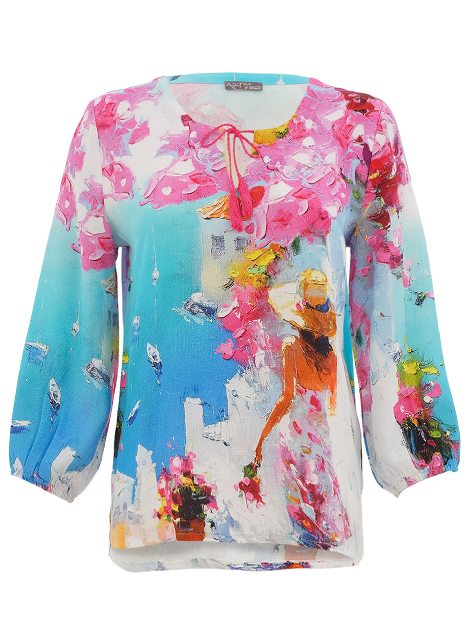 From the Summer in Santorini Collection, this vibrant blouse captures the luminous colors of the Aegean coast. A painterly fusion of turquoise blues and vivid pink florals evokes sunlit bougainvillea against whitewashed walls. Designed with a softly rounded neckline and delicate tie detail, along with relaxed three-quarter sleeves, it offers an effortless, flowing silhouette. Lightweight and expressive, this piece pairs beautifully with crisp white denim for a refined resort-ready look infused with Dolcezza’s signature art-inspired elegance.