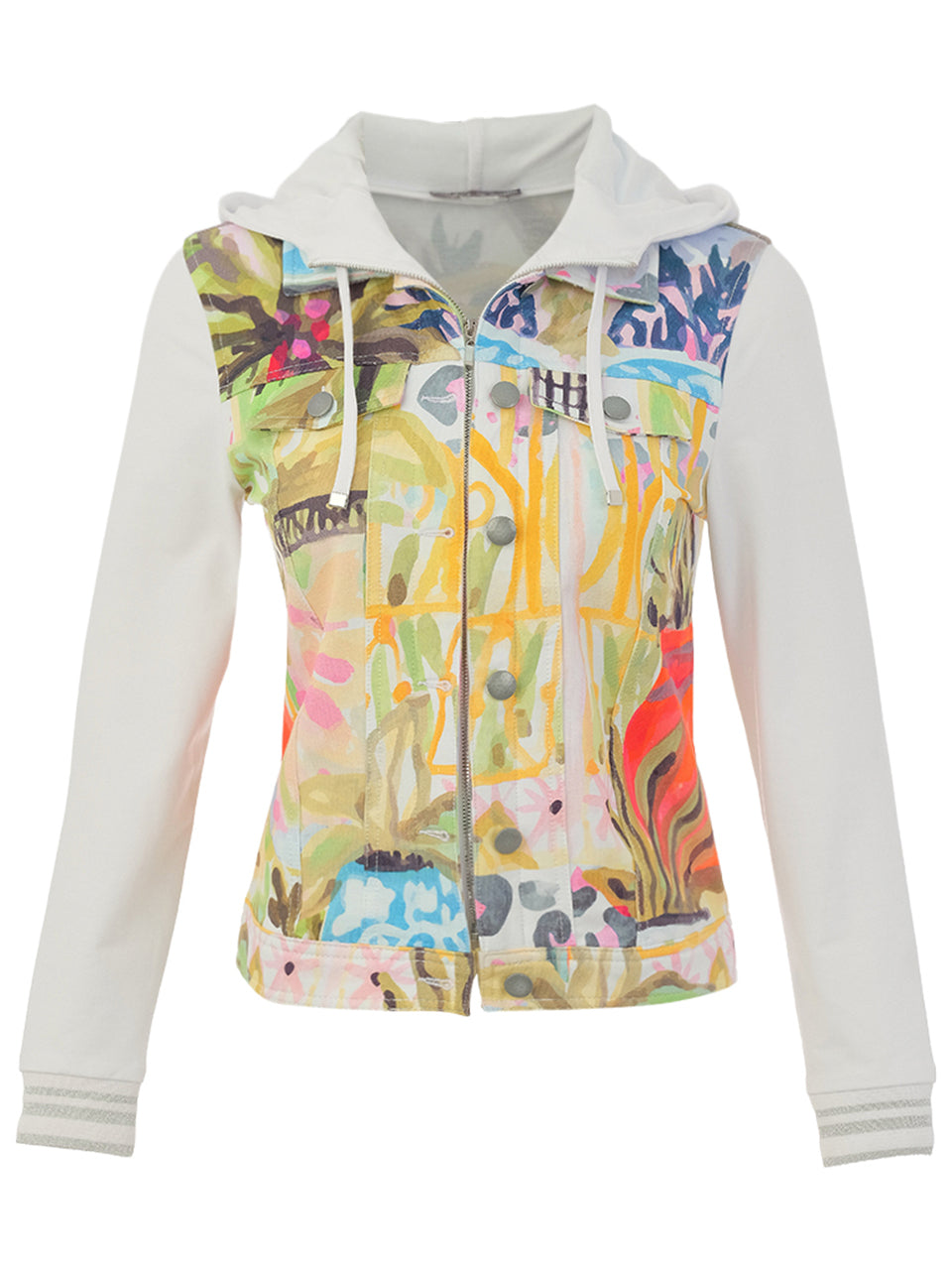 Sporty meets artistic in this statement zip-front jacket featuring a vibrant, patchwork-inspired print across the front panel. Blending tropical motifs, graphic elements, and bold color accents, the design creates a modern, gallery-worthy look. Solid sleeves and back offer balance and versatility, while the adjustable drawstring hood and front zipper add everyday functionality. Crafted for comfort with a flattering, streamlined fit, this piece is perfect for elevating casual denim or pairing with coordinating printed bottoms for a standout athleisure moment.