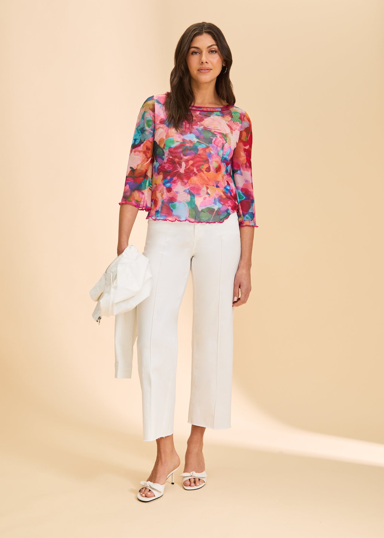 Lightweight and effortlessly elegant, this semi-sheer mesh top adds a refined touch to any look. Designed with a softly draped silhouette, it features a classic round neckline, flattering 3/4 sleeves, and delicate lettuce-edge trim at the hem and cuffs. The breathable mesh fabric layers beautifully over a cami or tank, making it perfect for day-to-night styling.