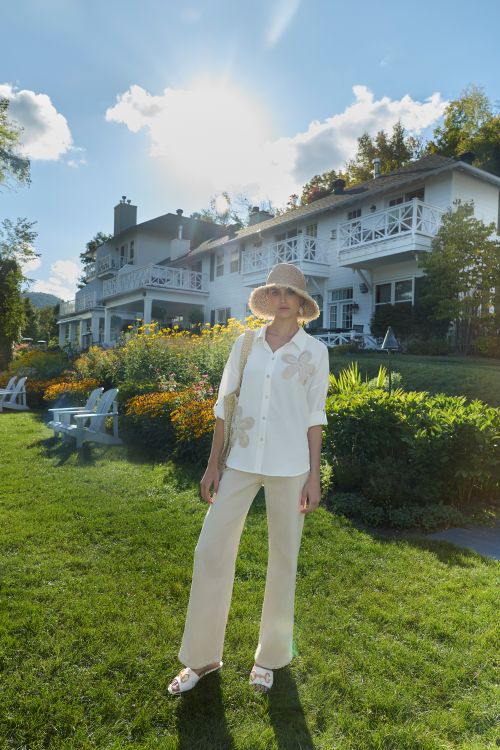 A classic white button-front shirt reimagined with eye-catching floral appliqués. Features a soft collar, roll-tab sleeves, and relaxed fit for all-day comfort. The dimensional bloom details add artistic flair and subtle shimmer, making this blouse a versatile statement piece that elevates any outfit from casual to polished.
