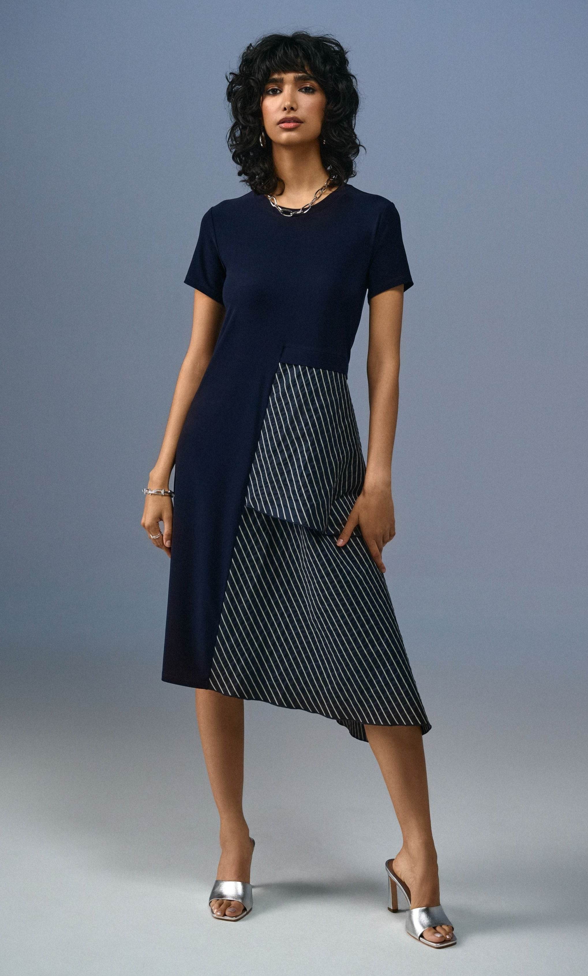 This unique silky knit dress exudes refinement and confidence. Crafted with a beautifully striped memory asymmetrical hem, this trapeze dress will make a subtle yet striking addition to your wardrobe. Featuring a crewneck and short sleeves, it is the perfect piece to stand out on any occasion.
