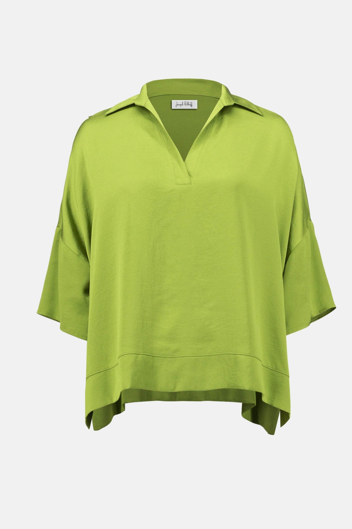 Elevate your everyday style with this satin top designed for effortless sophistication. Featuring a V-neckline with a classic shirt collar and three-quarter dolman sleeves, it offers a relaxed yet refined look. The boxy cut, enhanced by side slits and an asymmetrical hem, creates a graceful silhouette that’s perfect for building a standout outfit.