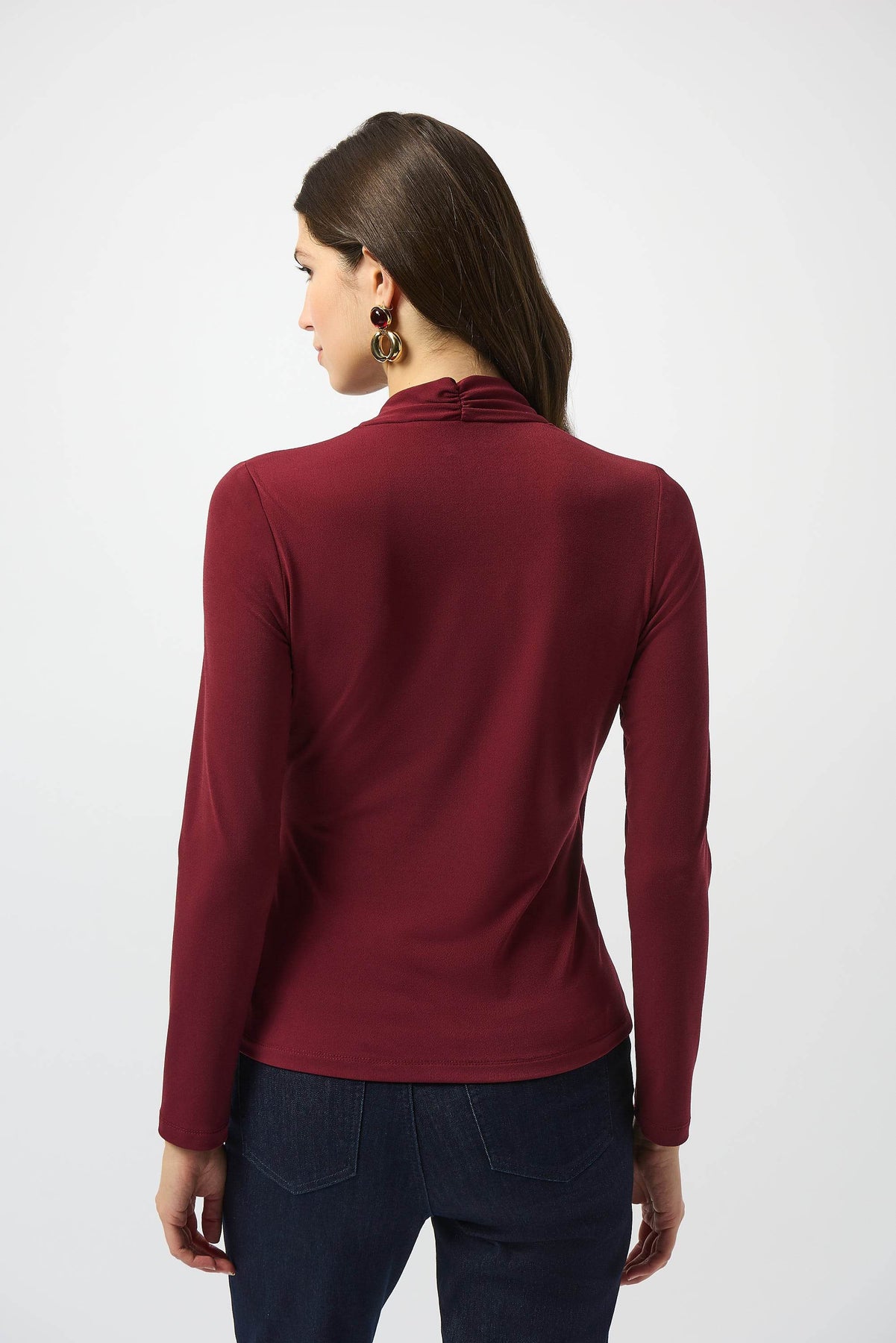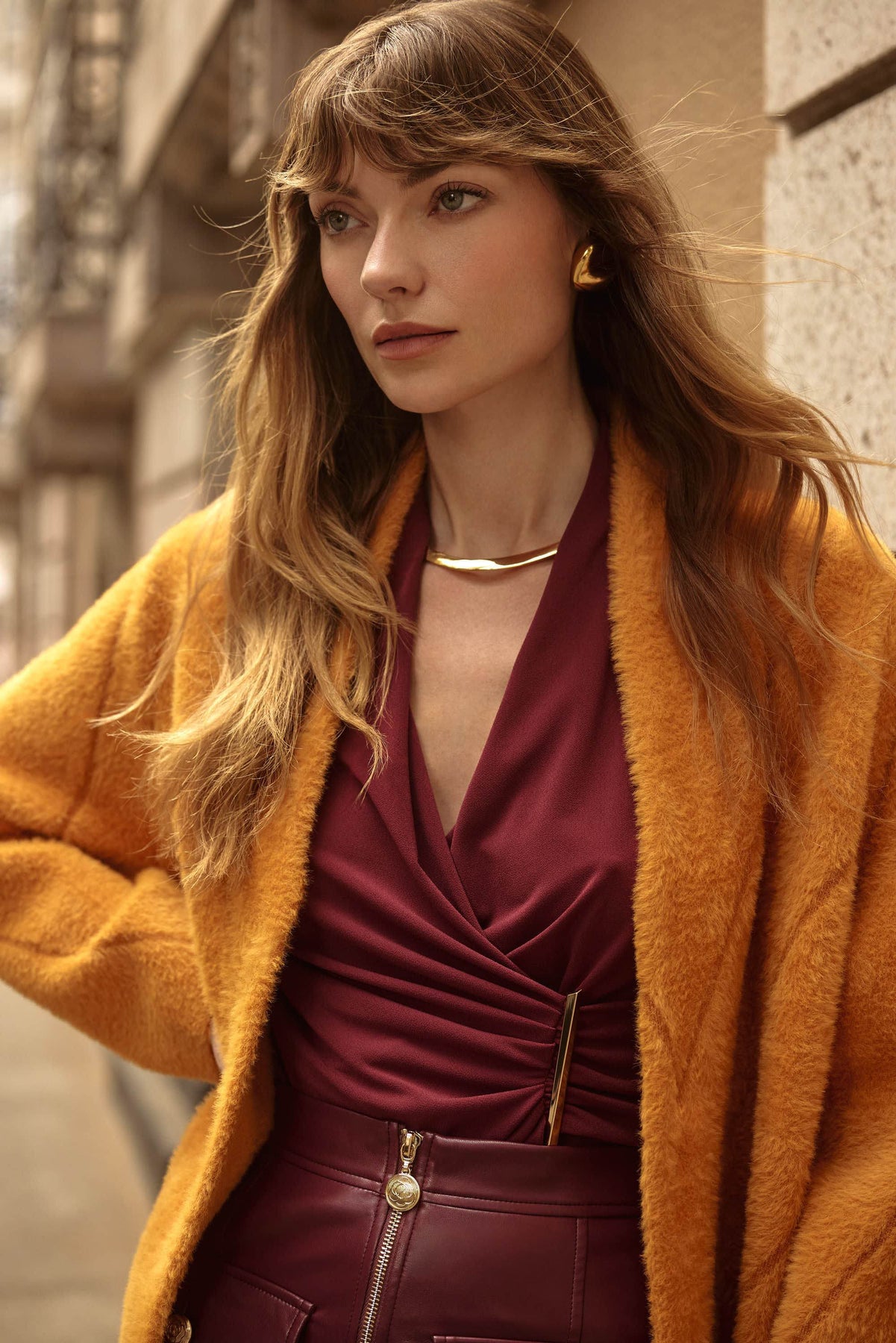 This moss crepe top boasts an undeniable elegance. The luxurious wrap collar as well as the pleated detail and ornament add to the garment’s stunning look. The fitted design gracefully flatters the silhouette and brings sophistication to any ensemble you create.