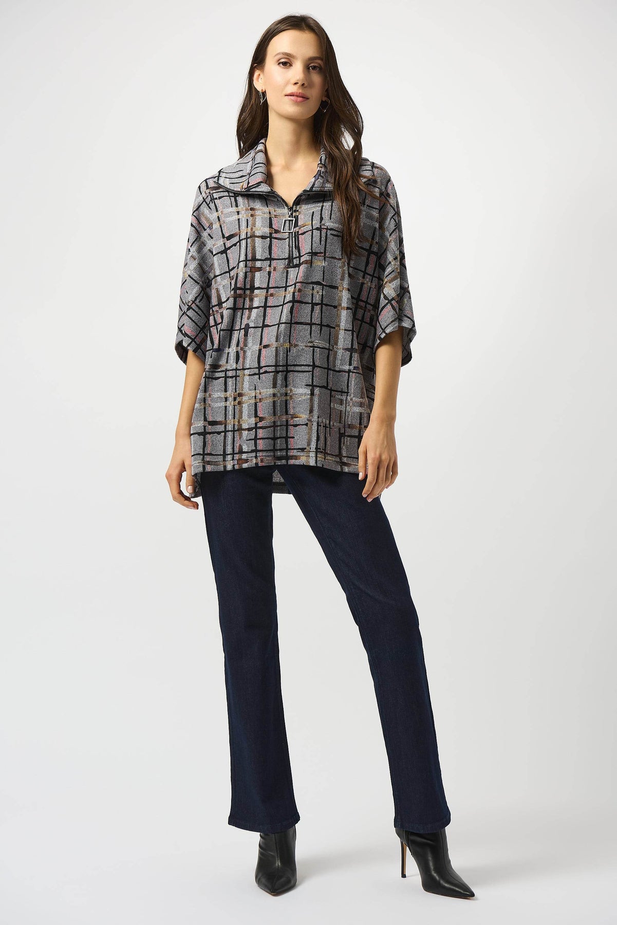 Crafted from cozy plaid sweater knit, this top combines classic elegance with a fresh, modern edge. Its boxy shape and three-quarter dolman sleeves create a comfortable yet chic look. The zippered collar adds a stylish detail, making this piece a standout addition to elevate your wardrobe effortlessly.