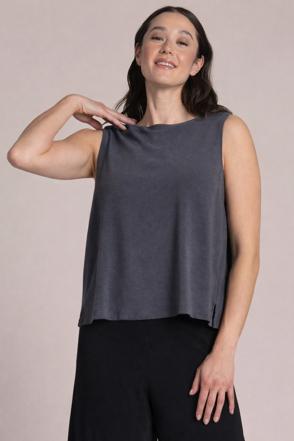Elevate your style with our sophisticated Flared Shell top, boasting a graceful boat neckline, relaxed yet structured boxy silhouette, and dual front and back lining for ultimate comfort. This effortlessly chic tank pairs perfectly with wide-leg trousers for a refined casual look. Embrace both comfort and fashion with this must-have wardrobe staple.