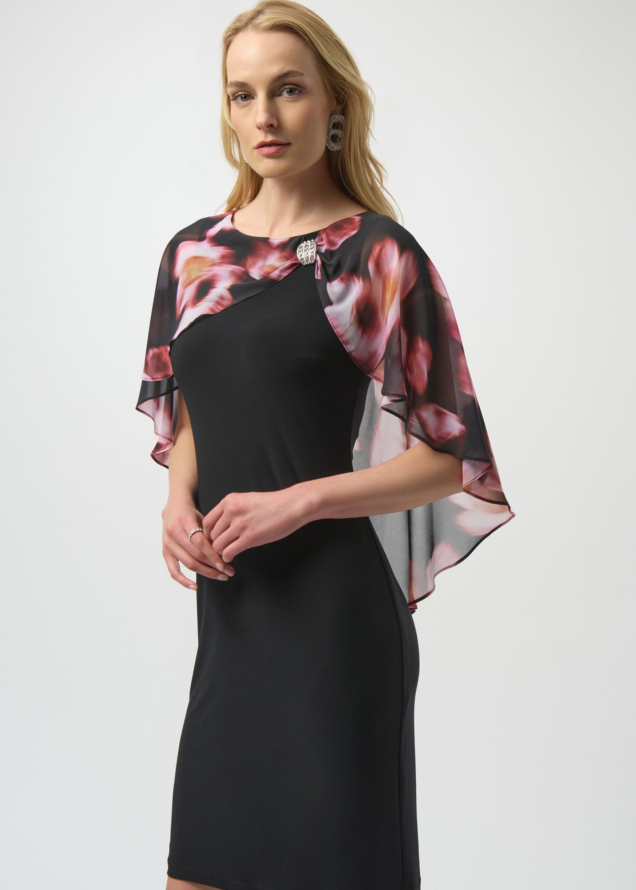 Cette superbe robe en maille soyeuse présente une silhouette fourreau élégante, rehaussée d'un imprimé floral éclatant mis en valeur par une cape fluide en mousseline. L'encolure bateau est ornée d'un strass scintillant, ajoutant une touche de glamour raffiné à l'ensemble.