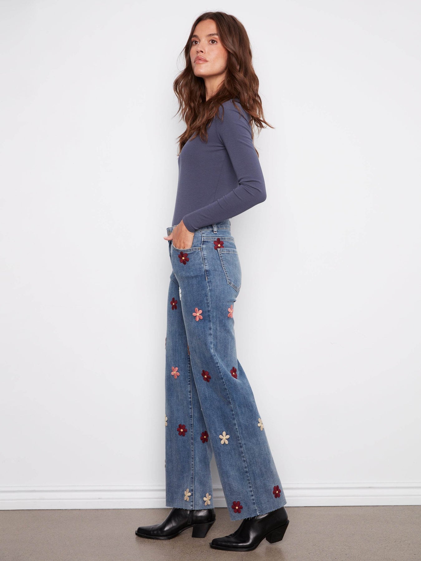 This section identifies the most frequently discussed product aspects and features that customers mention in their reviews for Wide Leg Jeans With Flower Patches. These topics help understand what customers care about most.