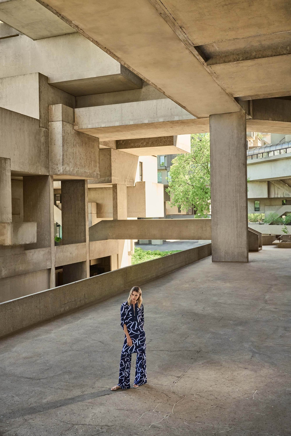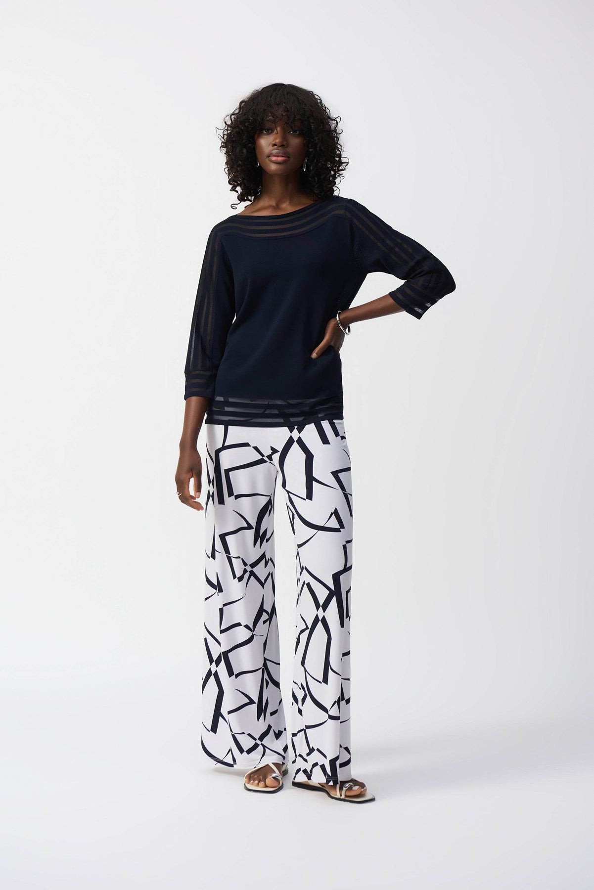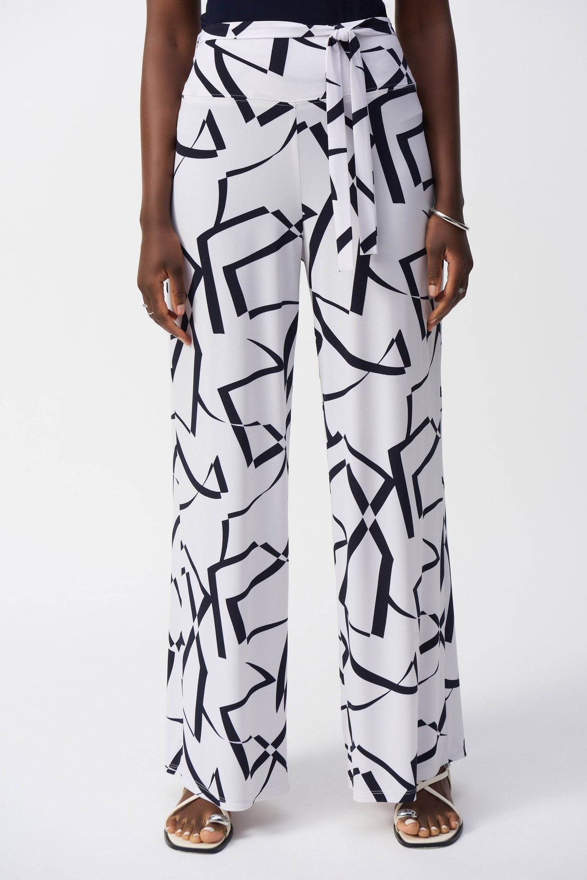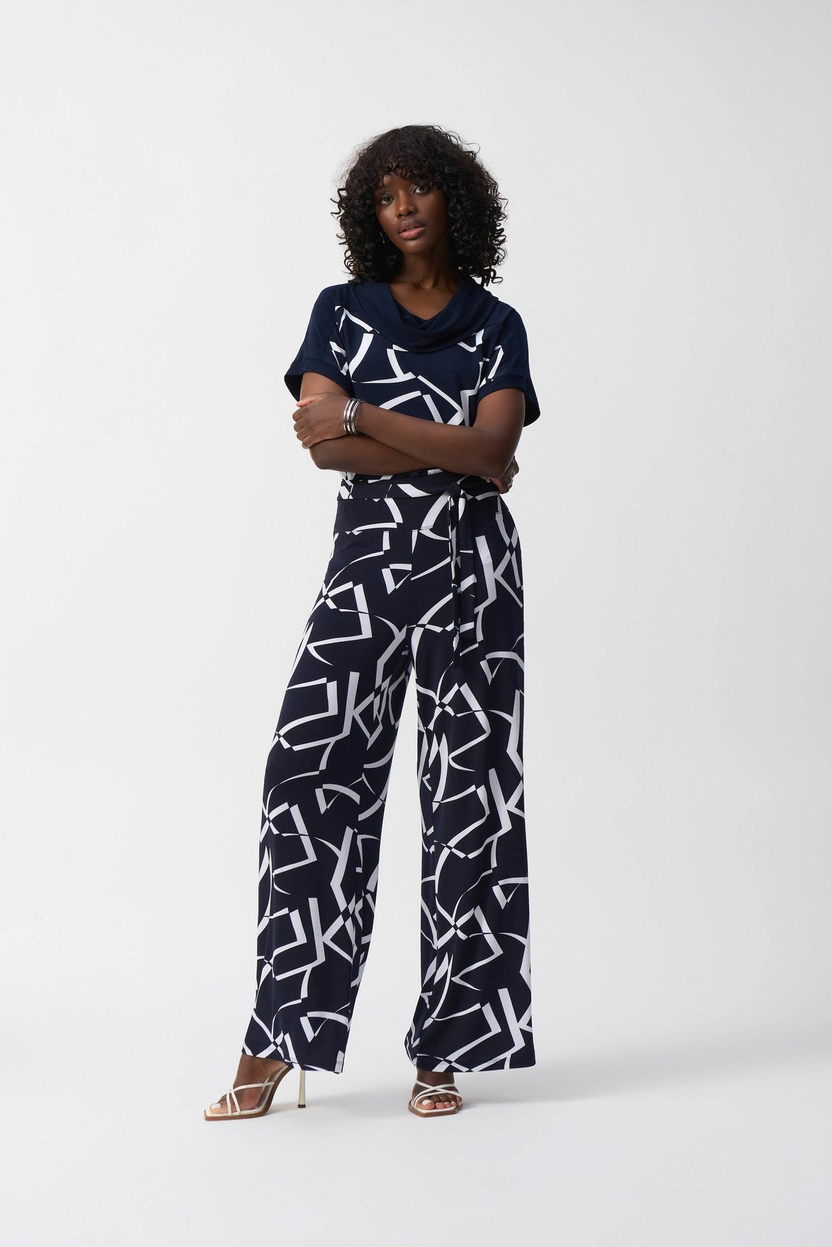 Que ce soit pour le travail ou les loisirs, ce pantalon large en maille soyeuse apportera une touche d'élégance à toutes vos tenues. Son imprimé géométrique captivant lui confère une profondeur unique, tandis que sa large ceinture assortie assure un confort optimal.