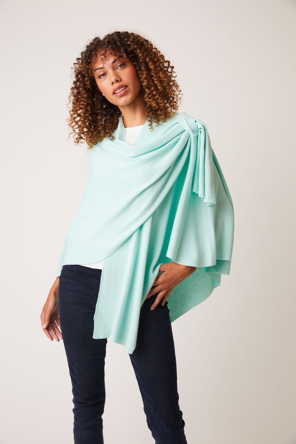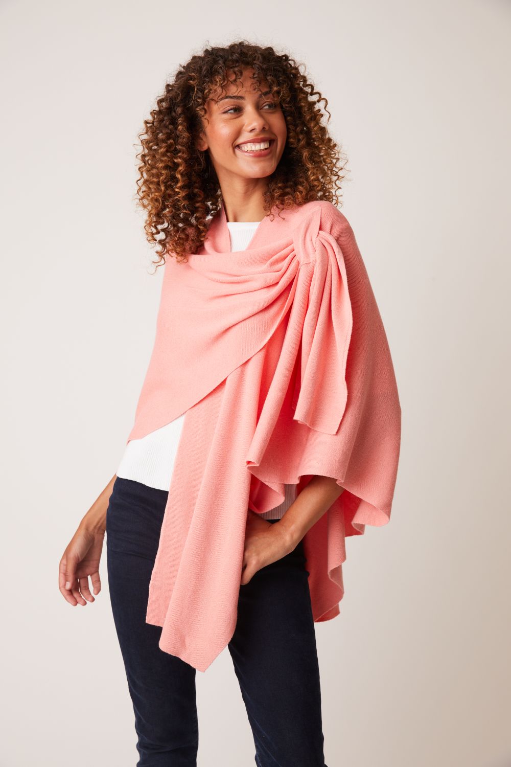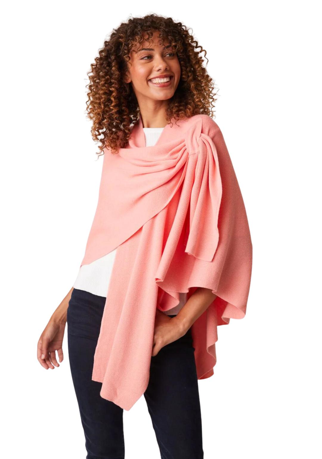 Love the design on shoulder with loop for inserting edge. Maintains the wrap in place and provides a dressy look. This is my 4th wrap.