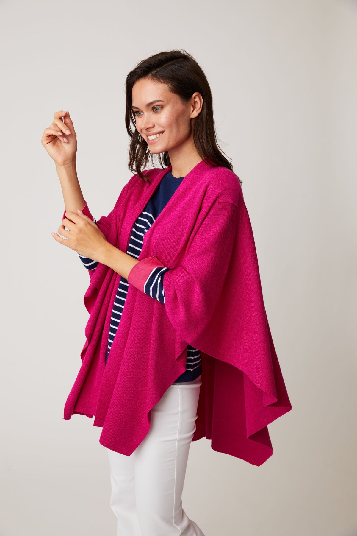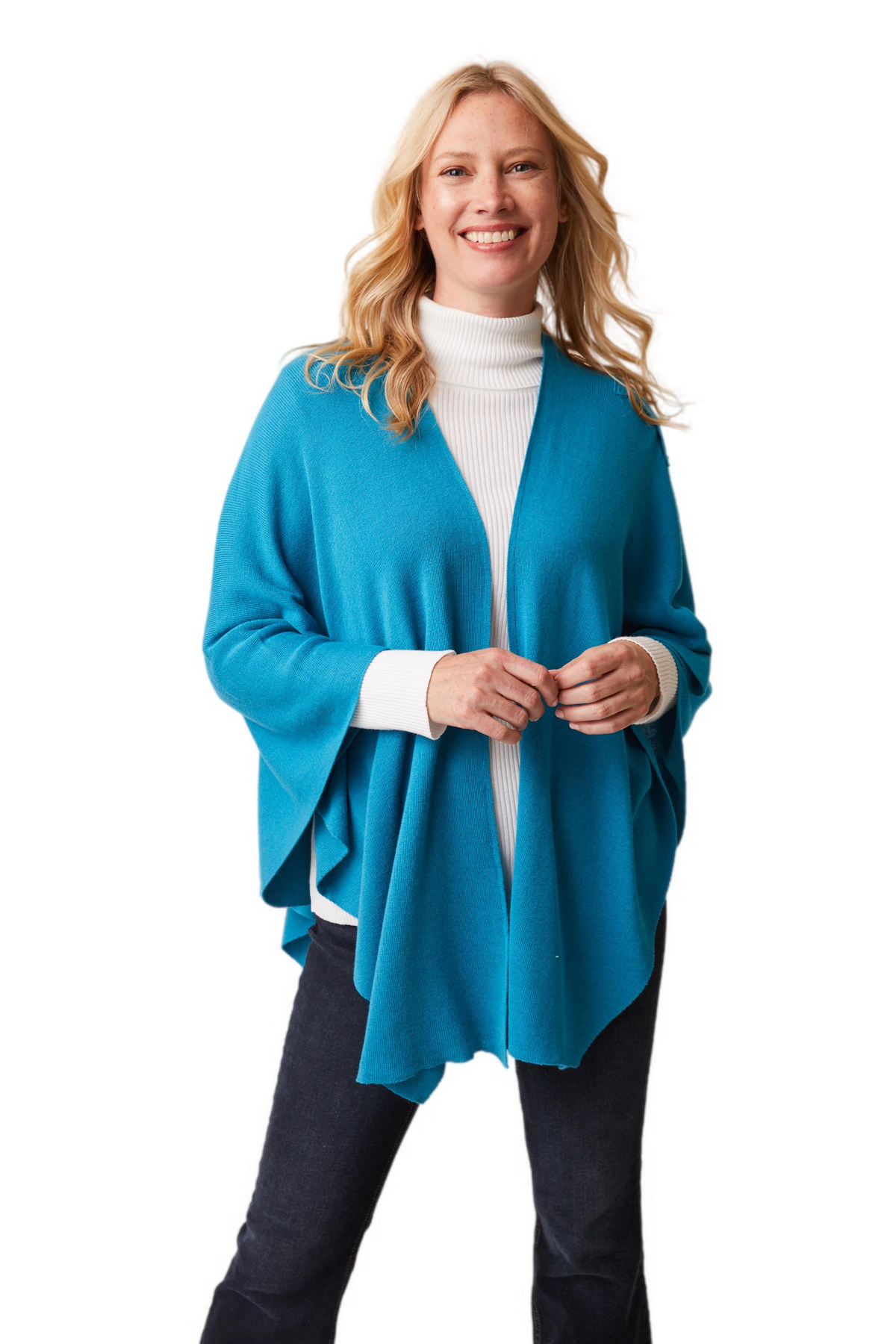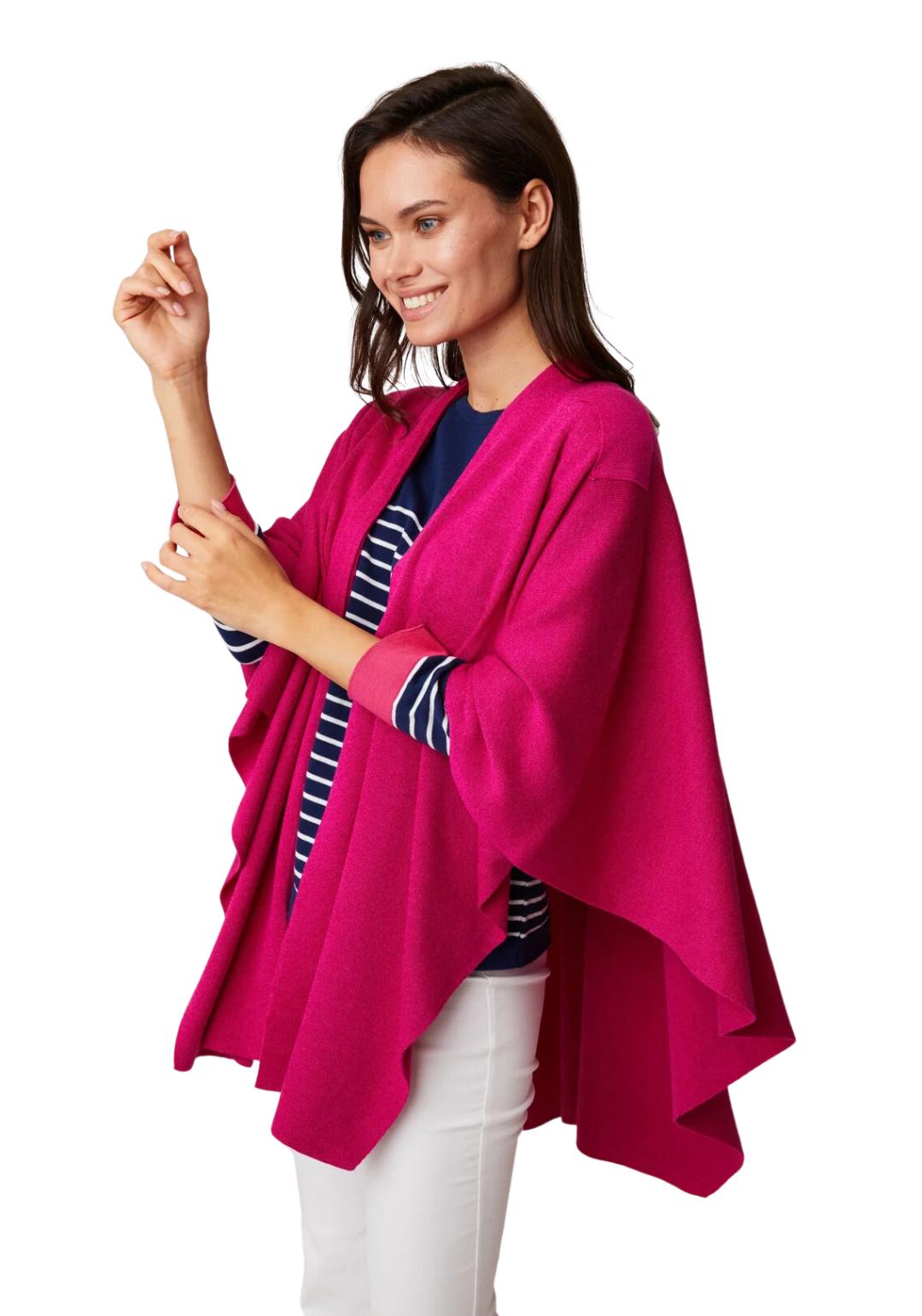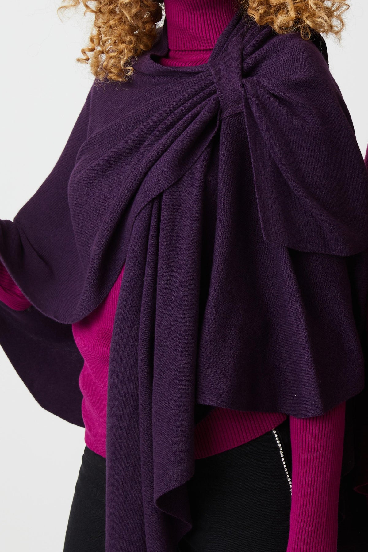 Love the design on shoulder with loop for inserting edge. Maintains the wrap in place and provides a dressy look. This is my 4th wrap.