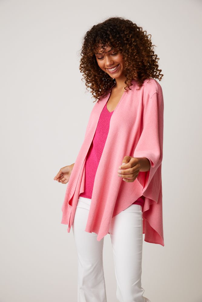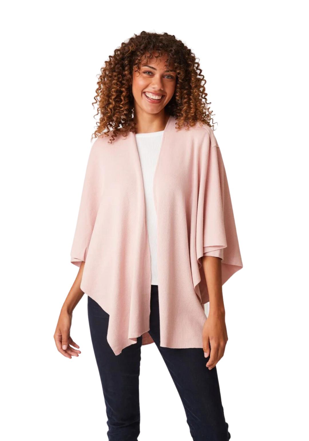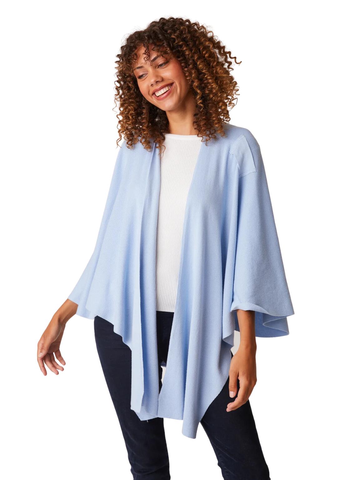 Soft material, fits great and looks awesome. great for travelling when you need several layers in airplanes, bus tours and even at night if you need a little extra blanket. The colour chambray is like baby blue, just beautiful.