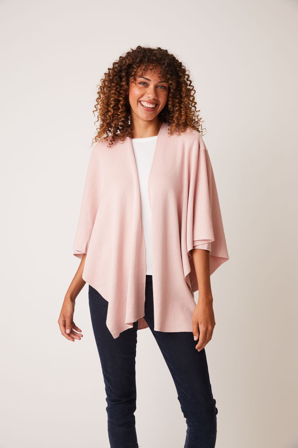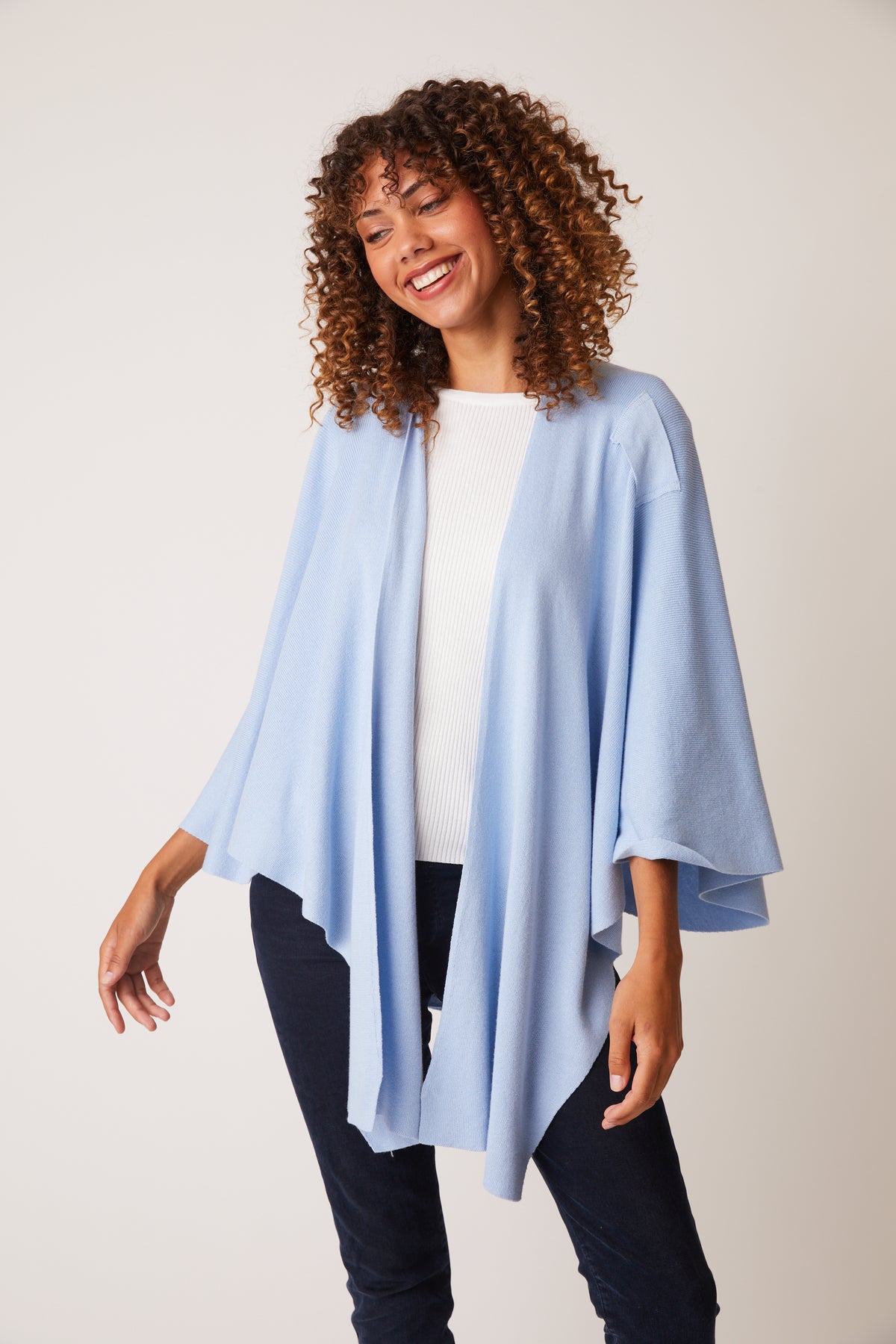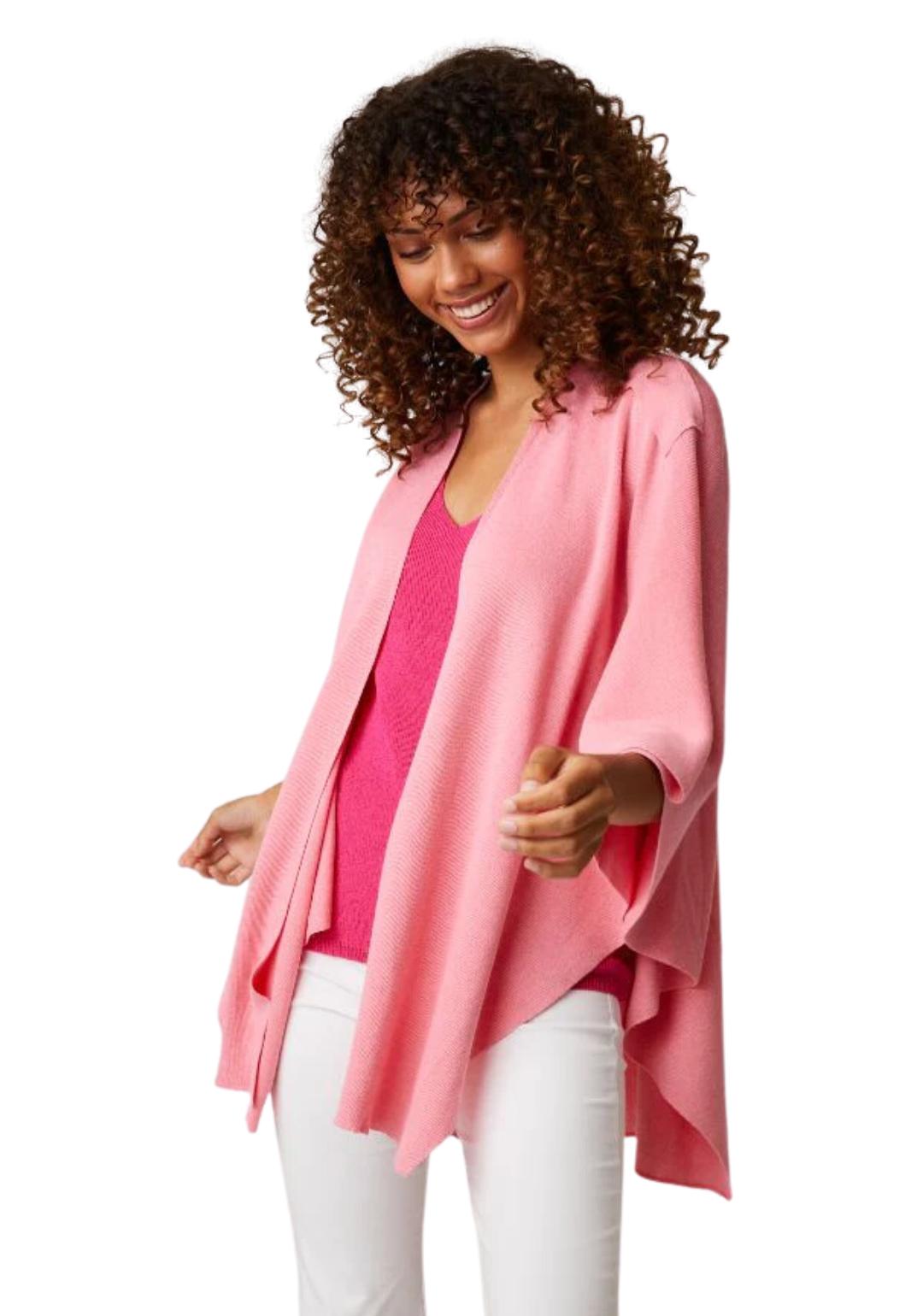 Soft material, fits great and looks awesome. great for travelling when you need several layers in airplanes, bus tours and even at night if you need a little extra blanket. The colour chambray is like baby blue, just beautiful.