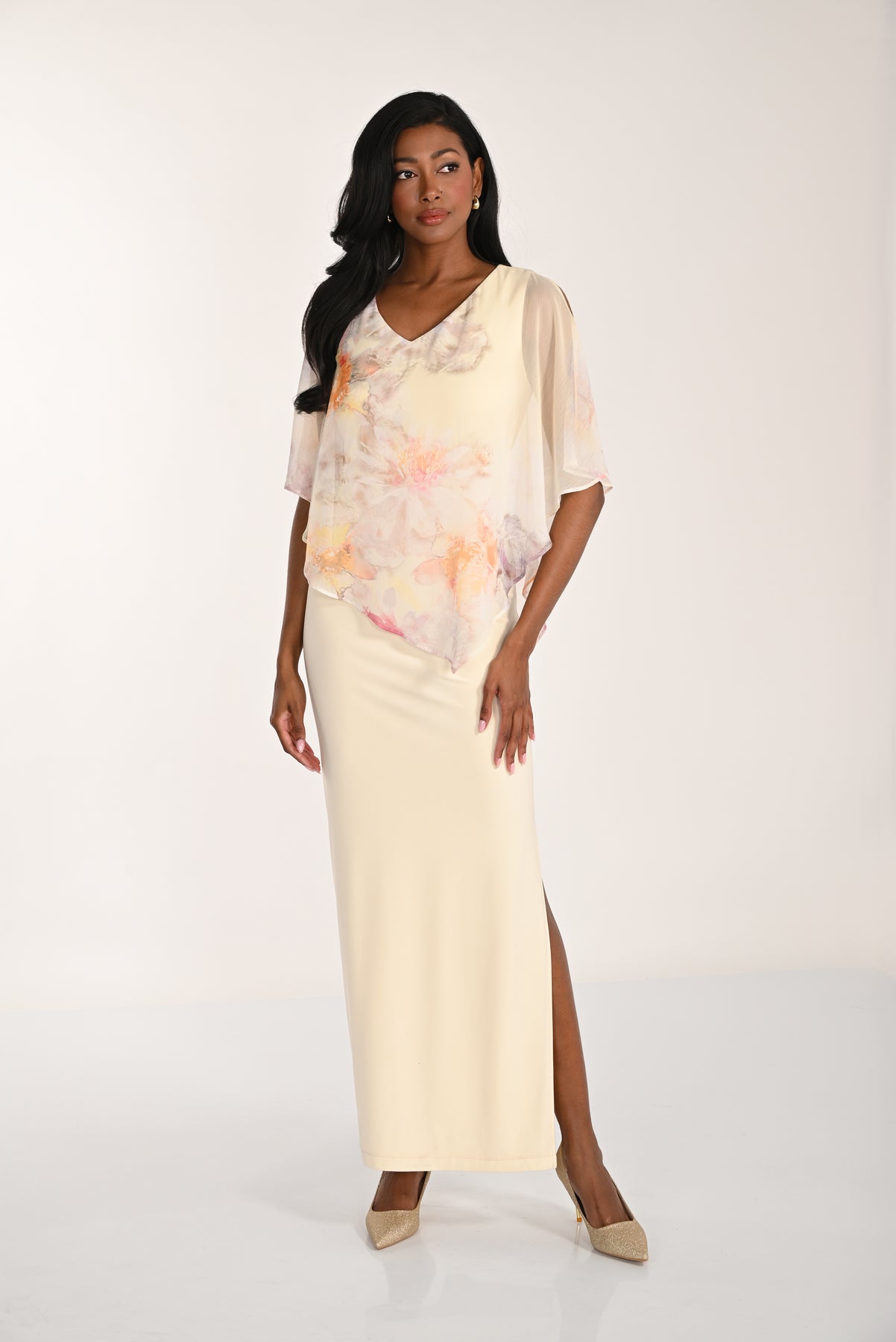 A stunning floor-length gown that combines elegance with comfort. The sleek silhouette is enhanced by a soft chiffon overlay featuring delicate pastel blooms, while the graceful cape-style layer adds movement and sophistication. The flattering V-neckline and champagne base create a timeless, romantic look perfect for weddings, formal events, and special occasions.