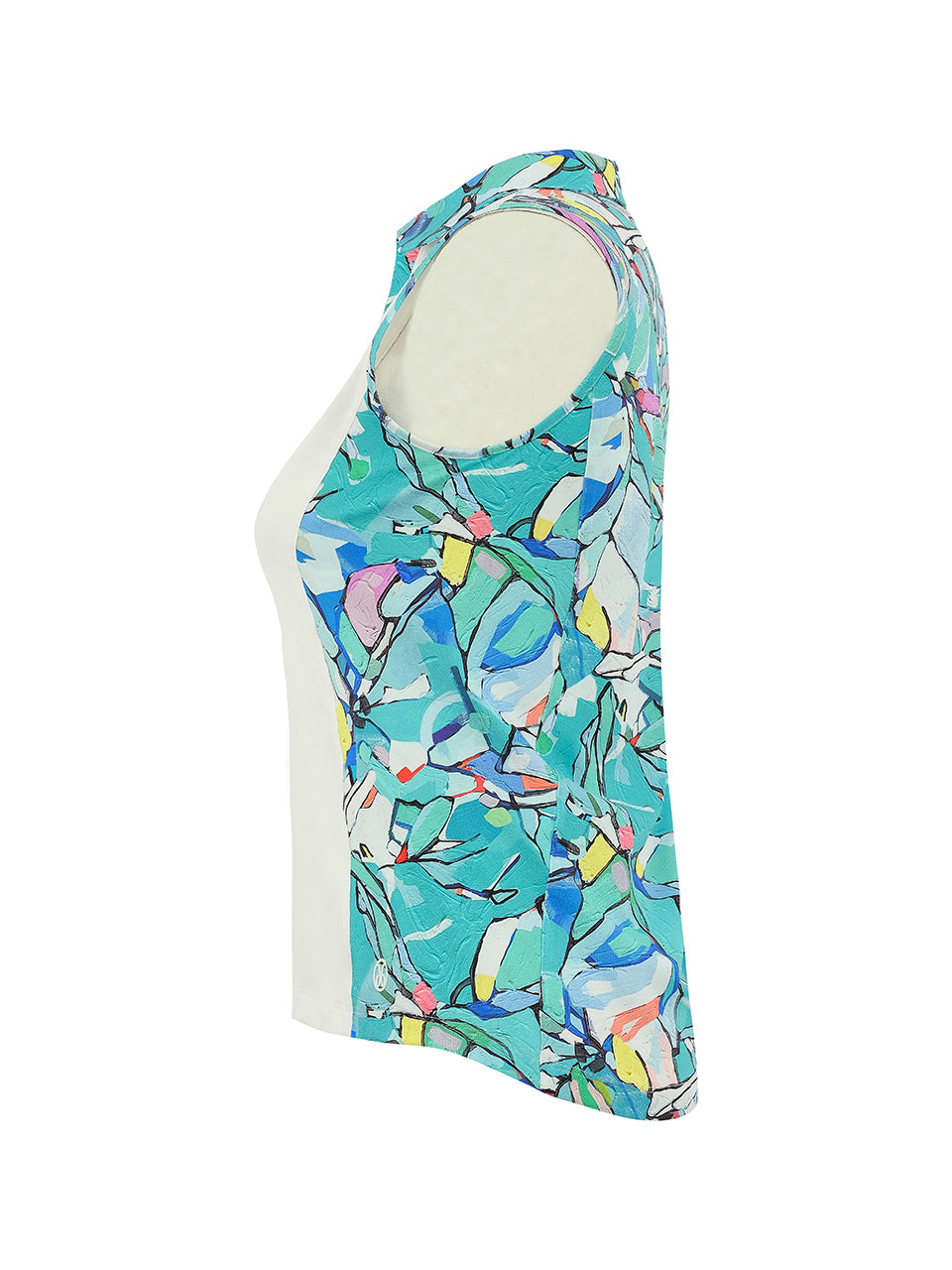 A polished sleeveless polo that blends sporty ease with artistic detail. The clean ivory body is accented by a vibrant mosaic-inspired print along the collar and sides, featuring fresh shades of turquoise, blue, and soft coral. Finished with a classic collar and flattering V-notch neckline, this lightweight top delivers comfort, movement, and modern elegance—perfect for the course or casual summer styling.