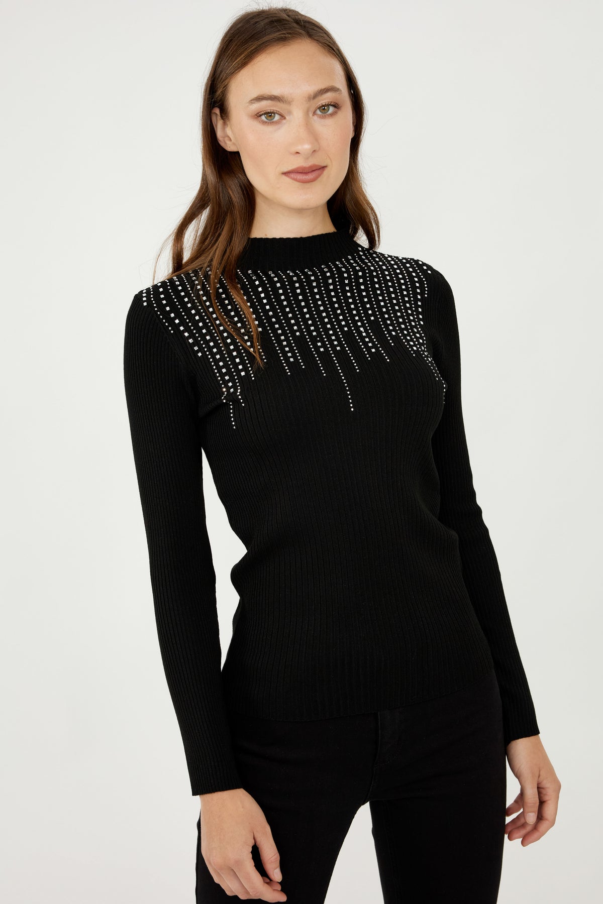 Make a statement with this sleek knit top featuring cascading crystal fringe across the neckline. Designed with a fitted silhouette and high neckline, it offers a polished look with eye-catching sparkle. Perfect for elevating evening outfits or adding glamour to a simple pair of pants. ✨
