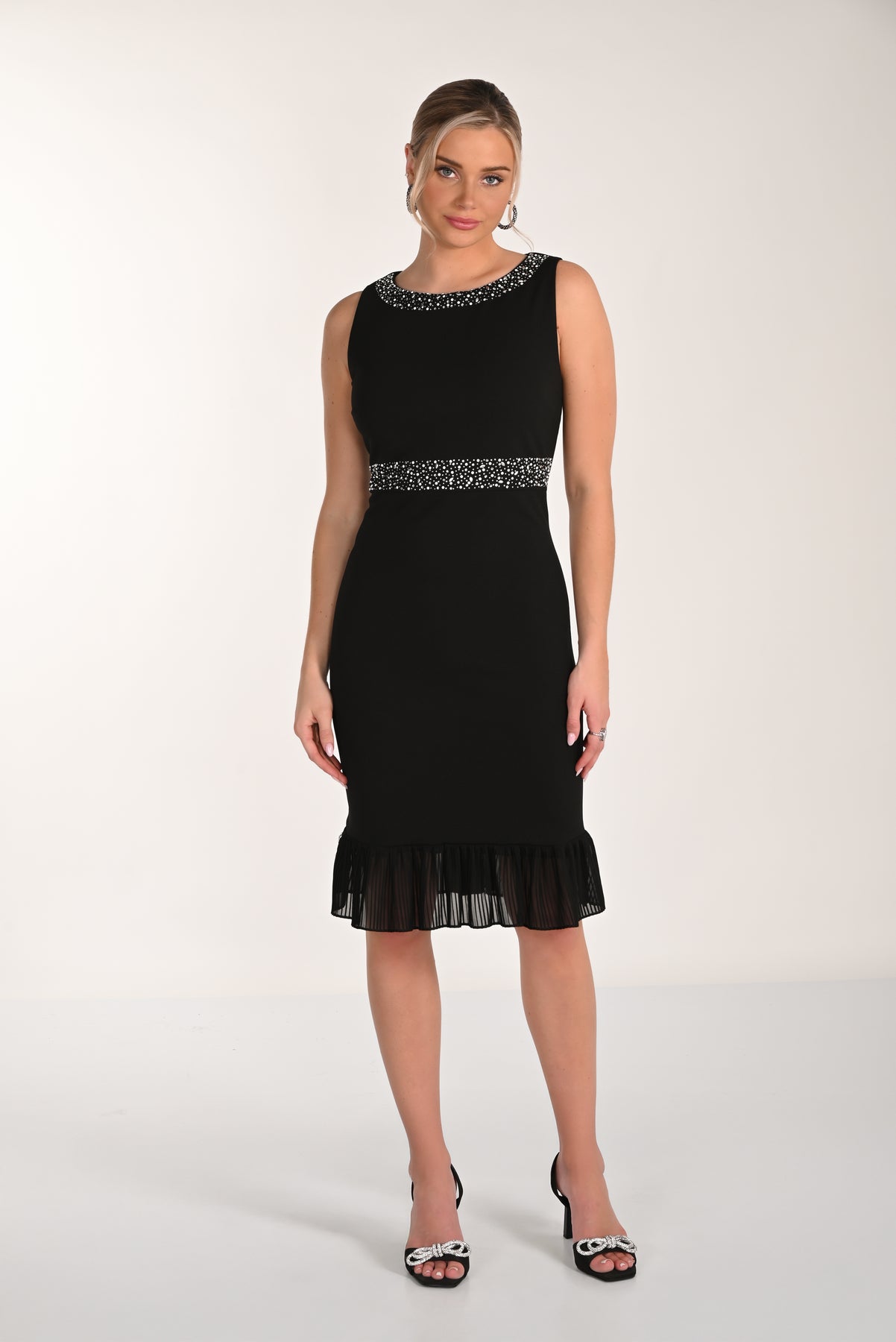 Stunning fitted cocktail dress with shimmering crystal trim at the neckline and waist. The sleeveless design offers a polished, elegant look perfect for evening events. Flattering silhouette with refined details that catch the light beautifully.