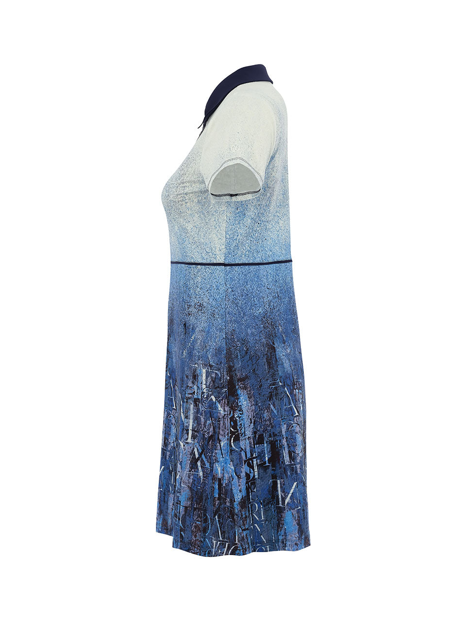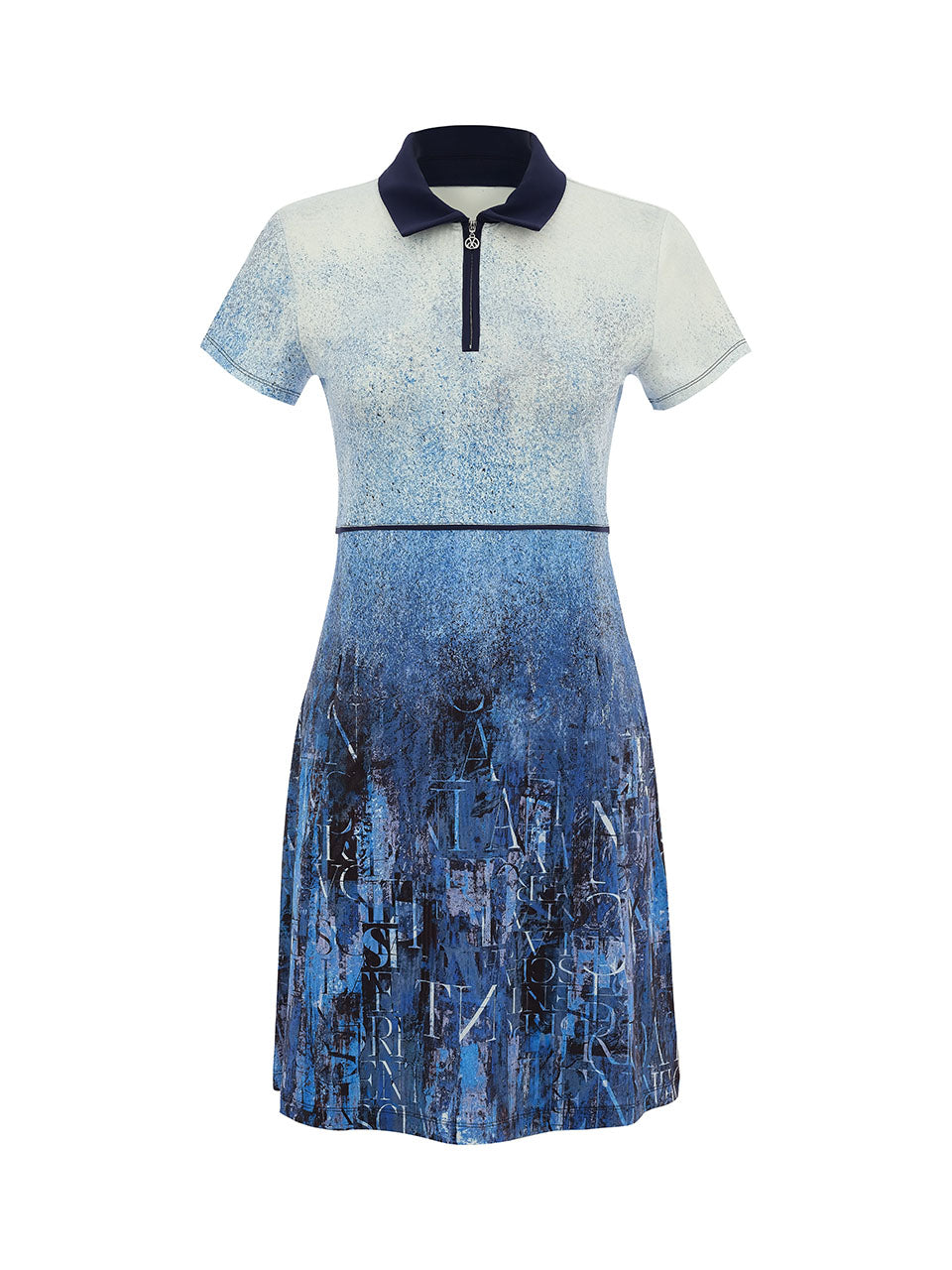A modern collared T-shirt dress featuring the striking Echo in Blue print that blends soft ivory tones into rich shades of indigo with layered abstract lettering. Designed with a sporty zip neckline and classic collar, this flattering silhouette offers effortless comfort and movement. The lightweight stretch fabric and softly shaped waist make it perfect for the golf course, travel, or casual summer days while maintaining a polished athletic look.