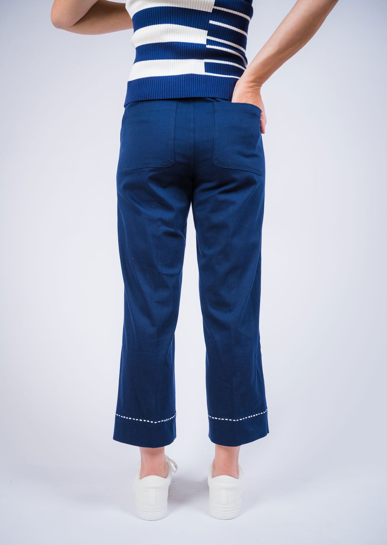 These modern cropped pants combine effortless comfort with a clean, polished look. Designed with a flattering mid-rise fit and a straight-leg silhouette, they fall just above the ankle for a fresh, contemporary feel. The smooth fabric offers structure with ease of movement, while front pockets add practical everyday style. A subtle stitched detail near the hem gives the design a refined finishing touch. Perfect for pairing with knit tops, blouses, or casual sneakers for an easy yet elevated
