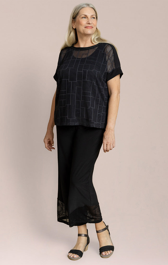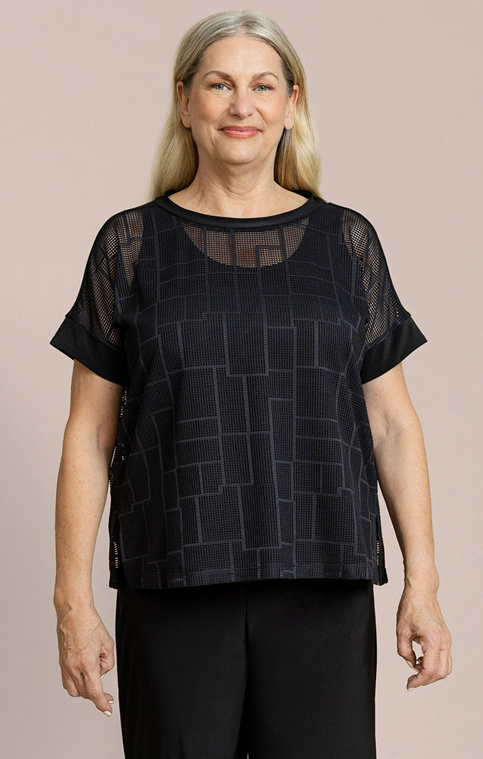 Elevate your evening style with this sophisticated sheer overlay top. Designed with a relaxed silhouette, this piece features a lightweight mesh layer adorned with subtle geometric detailing that adds texture and dimension. The soft short sleeves and easy drape create a flattering, comfortable fit, while the opaque lining ensures effortless wear. Perfect for pairing with dress pants or skirts, this elegant top transitions seamlessly from dinner events to special occasions with refined, modern charm.