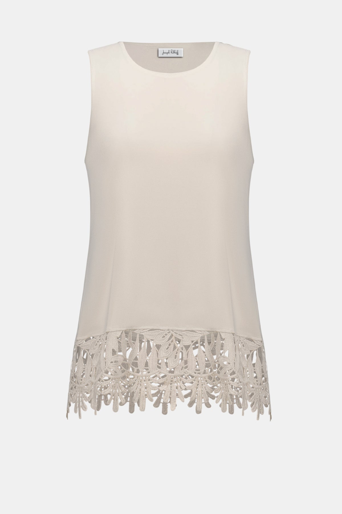 This sleeveless silky knit top features a straight silhouette, finished with a scalloped guipure lace hem that brings subtle texture and a refined, elegant touch.