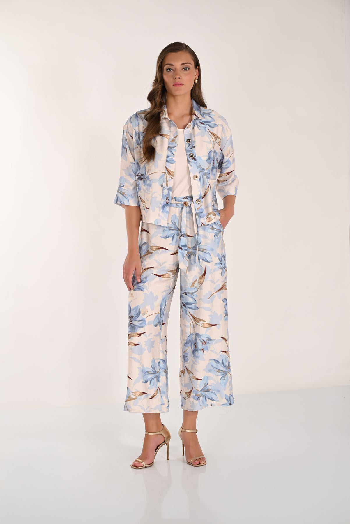 Light and effortlessly elegant, these wide-leg pants feature a soft floral print and a flowing silhouette. Designed with a flattering high-rise waist and a self-tie belt, they create a defined shape while maintaining comfort and ease. The cropped length adds a modern touch, while the airy fabric moves beautifully with every step. Perfect for warm days, they pair seamlessly with simple tops for a polished yet relaxed look.