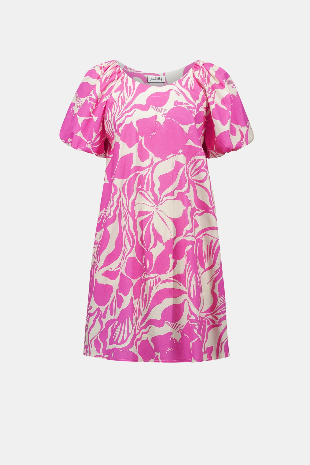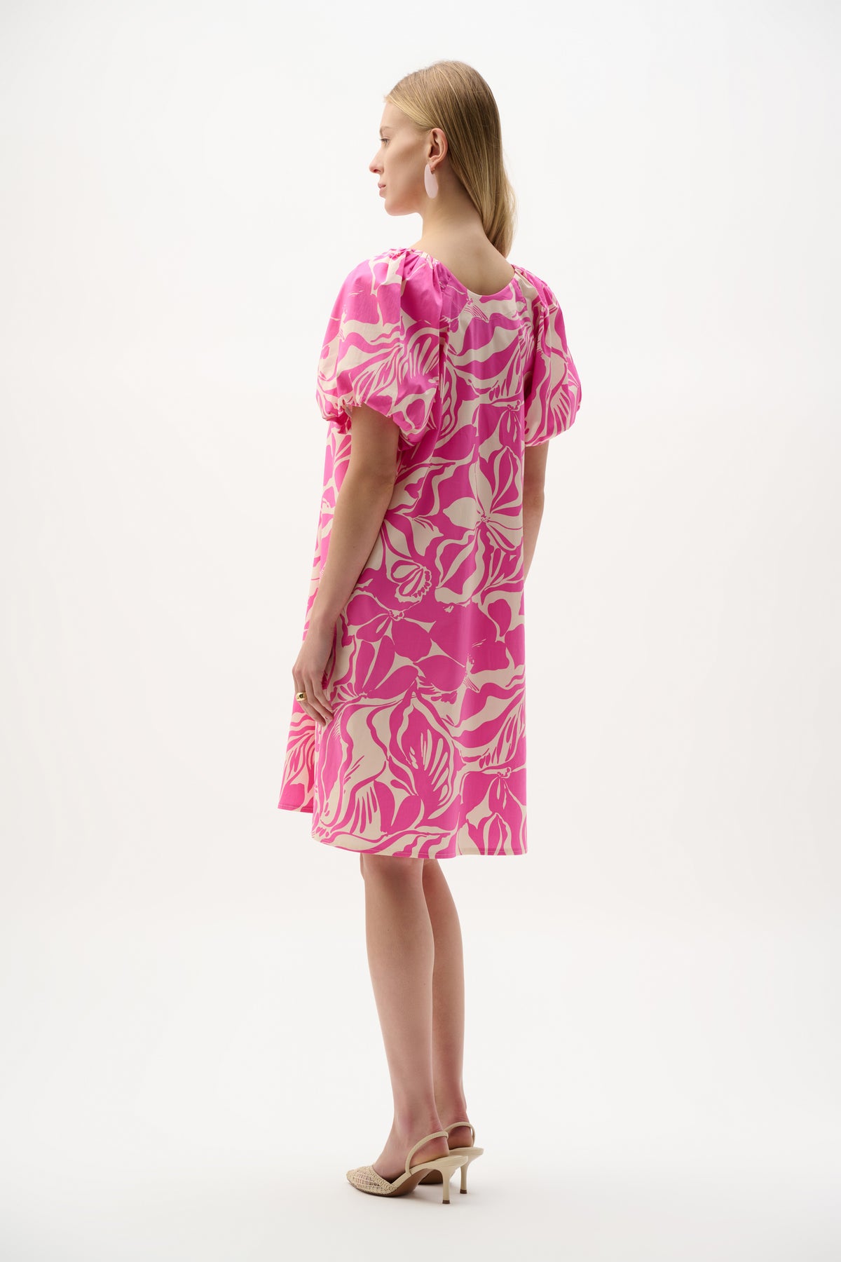 Floral stretch cotton gives this trapeze dress a breezy, feminine energy. A scoop neckline balances short puff sleeves with gentle volume, while side pockets and a knee-length cut keep the silhouette practical yet effortlessly refined.