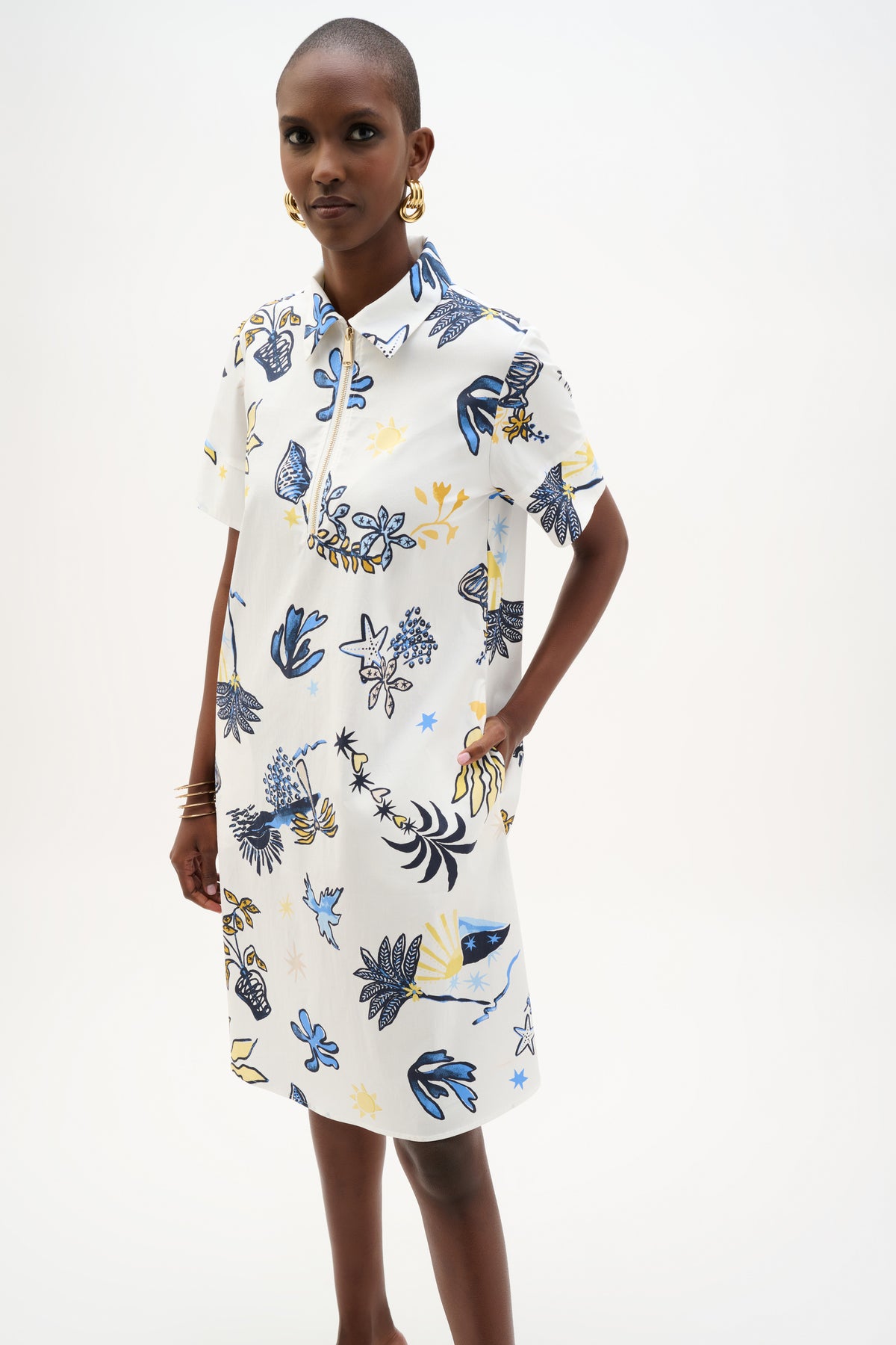 This stretch cotton A-line dress features a tropical print with a shirt collar and front metal zipper for a modern touch. Short cuffed sleeves and side pockets add ease to its knee-length silhouette.
