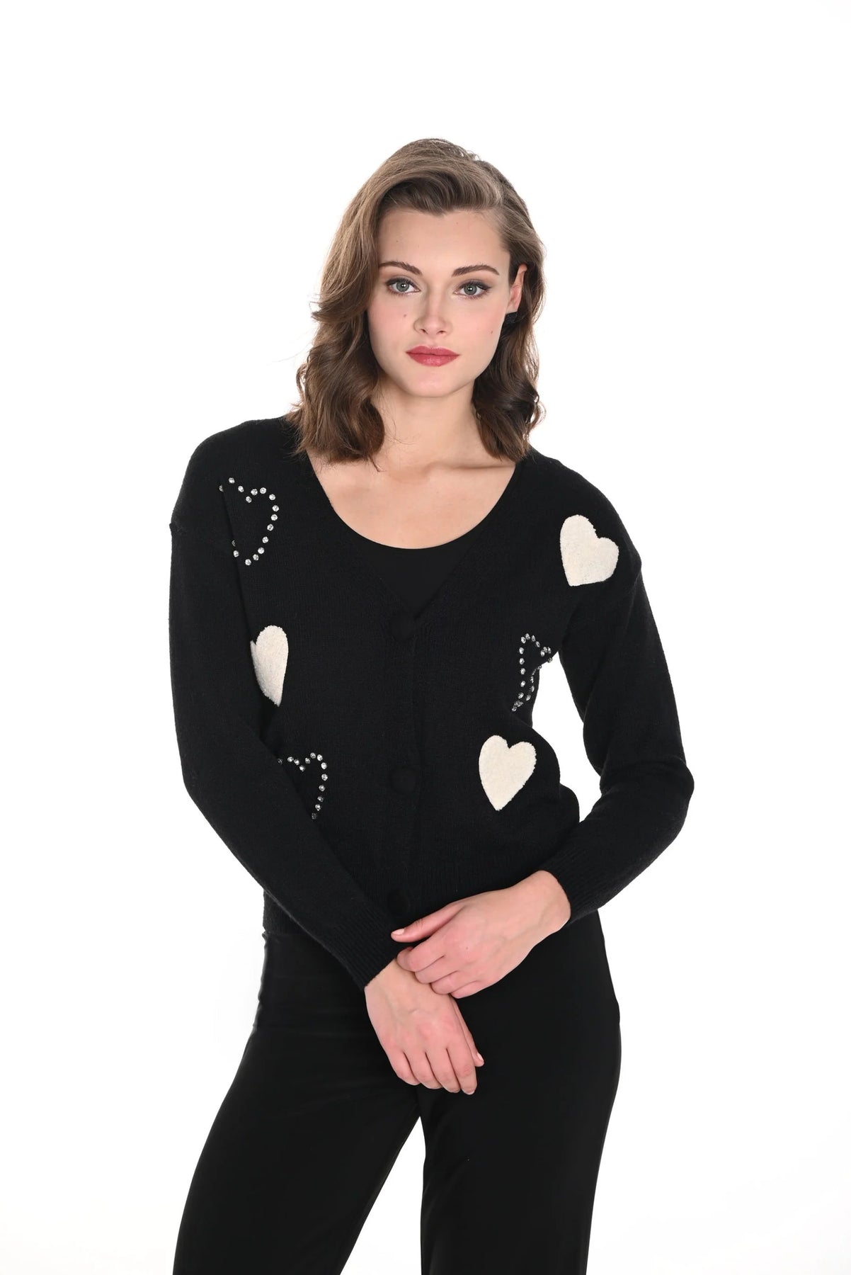 This cozy knit cardigan brings a charming touch to your everyday wardrobe. Featuring soft heart appliqués and subtle studded heart outlines, it blends playful detail with classic comfort. Designed with a round neckline and button-front closure, it’s perfect for layering over tees or dresses for an effortlessly stylish look.