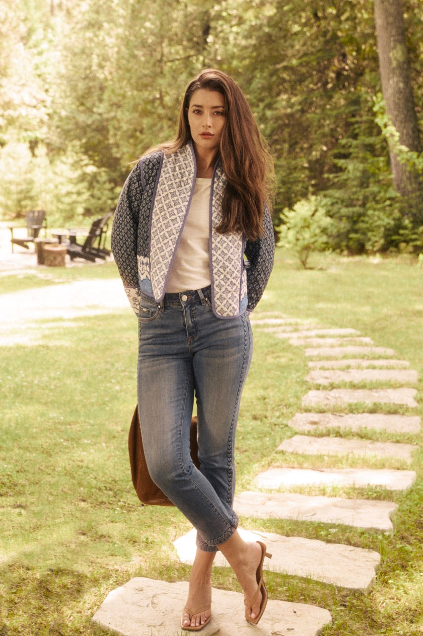 Reversible quilted jacket with eye-catching blue-toned patchwork prints. Features an open front, soft stand collar, and cropped cut for a flattering, modern look. Lightweight and cozy, it's the ideal statement piece to transform everyday outfits with artistic flair and effortless style.
