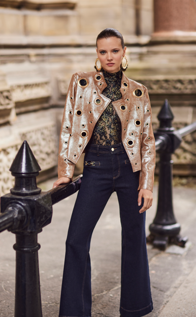 A classic jean with a refined, fashion-forward twist. These dark-wash wide-leg jeans feature elegant gold icon buckle detailing at the hips, adding a polished touch that elevates them beyond everyday denim. The high-rise fit smooths and flatters, while the wide leg drapes beautifully for a long, lengthening silhouette. Comfortable, versatile, and effortlessly chic